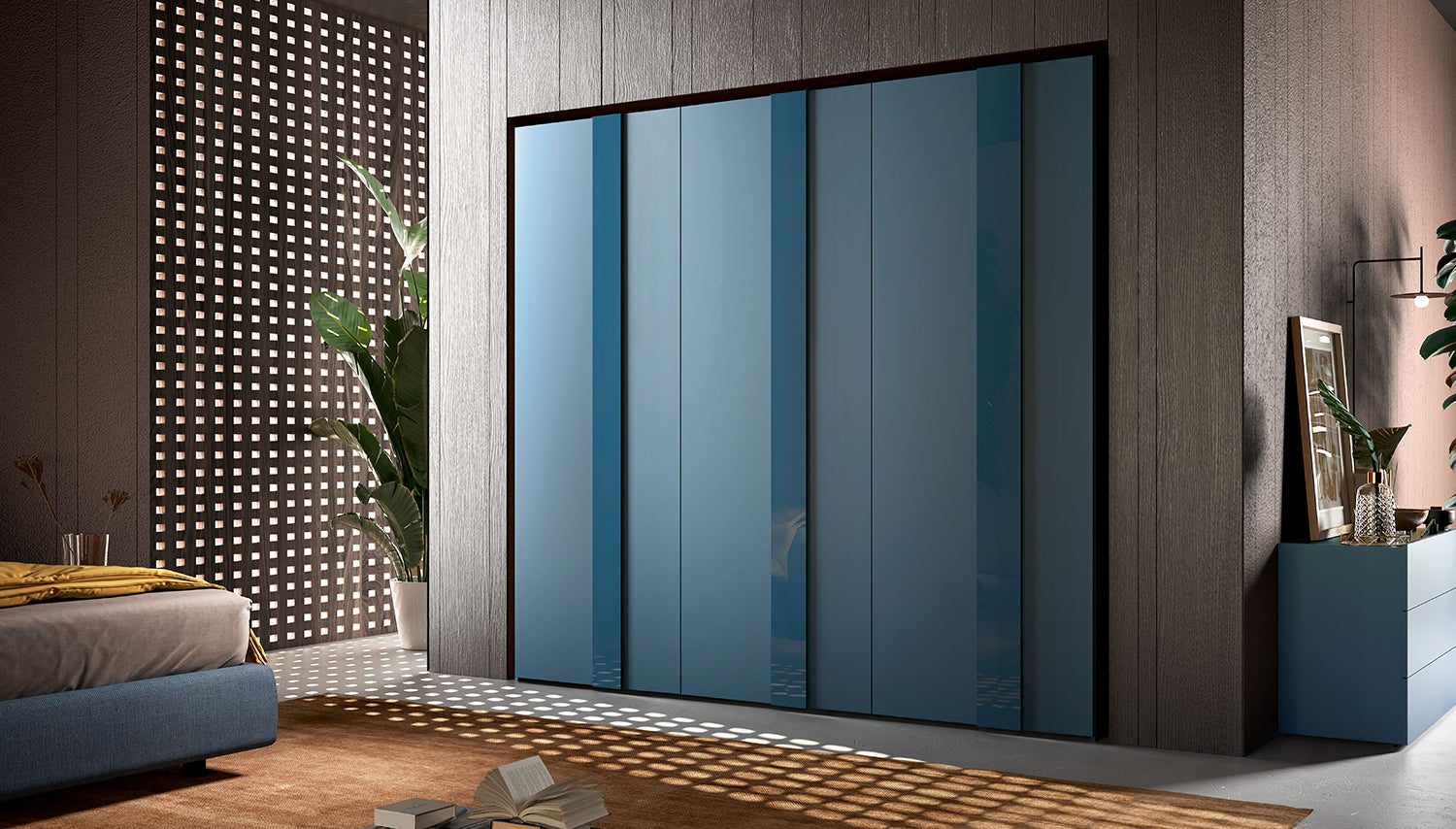 Armadio battente 6/a da 45 Frame L 276 H 252 P 60,3 RAL 5009 laccato opaco mat, maniglia Frame RAL 5009 laccata lucida. Cerniere Soft Closing.