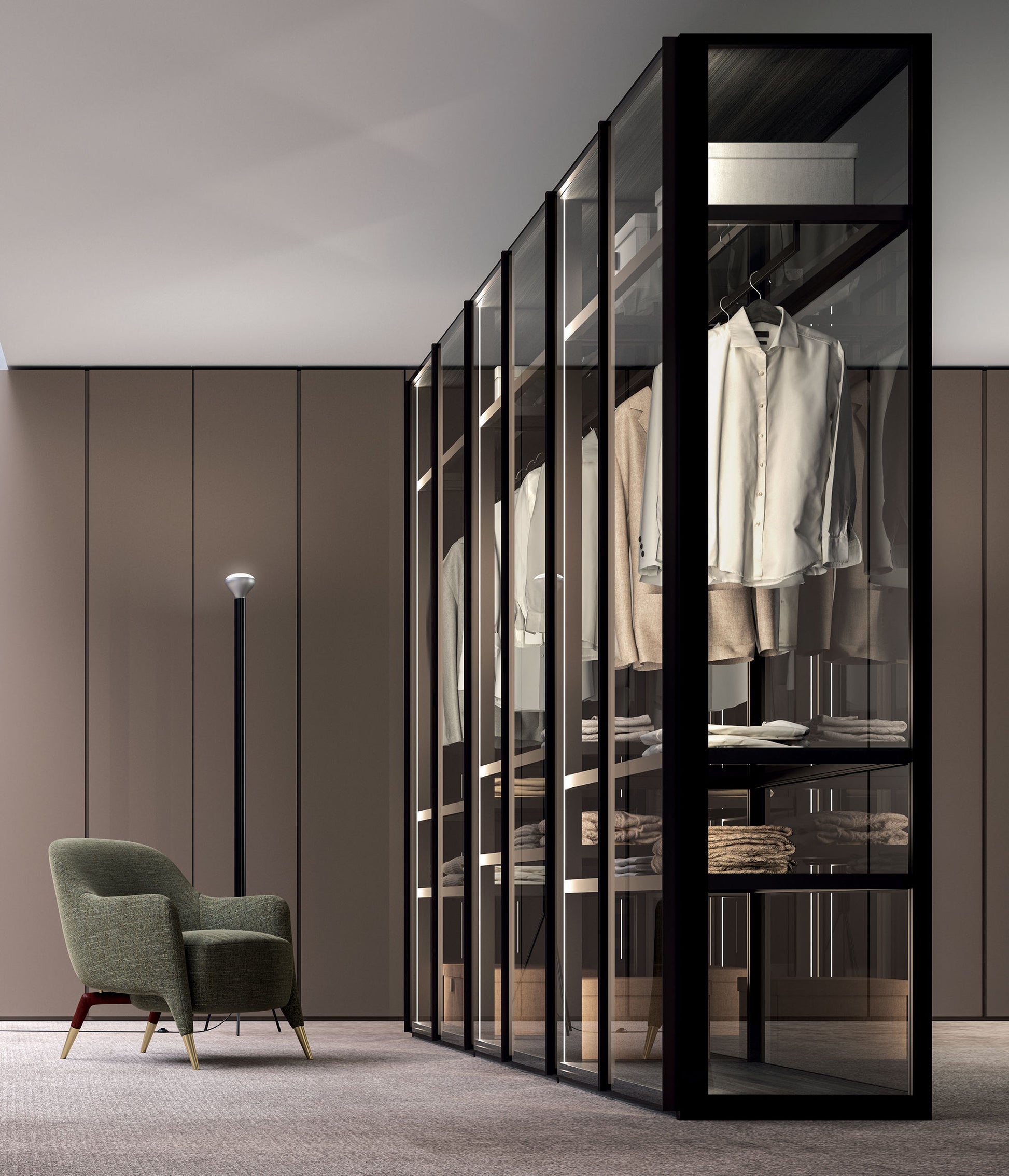 Ante, spalle e schienali in vetro, illuminazione led e struttura modulare a telaio contribuiscono a ridefinire gli spazi della zona notte aprendo nuove prospettive.