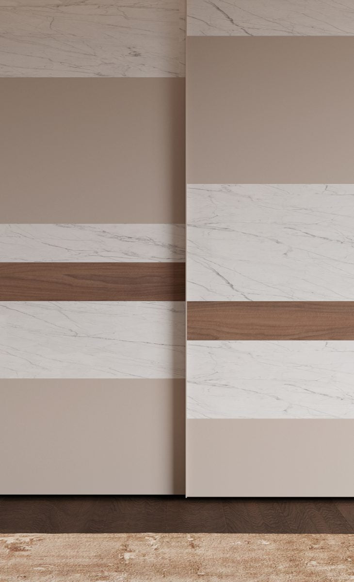 Les portes Decor deviennent un élément décoratif pour les murs de la chambre. Grâce à son reflet, le verre effet Bianco Statuario souligne le réalisme du marbre.