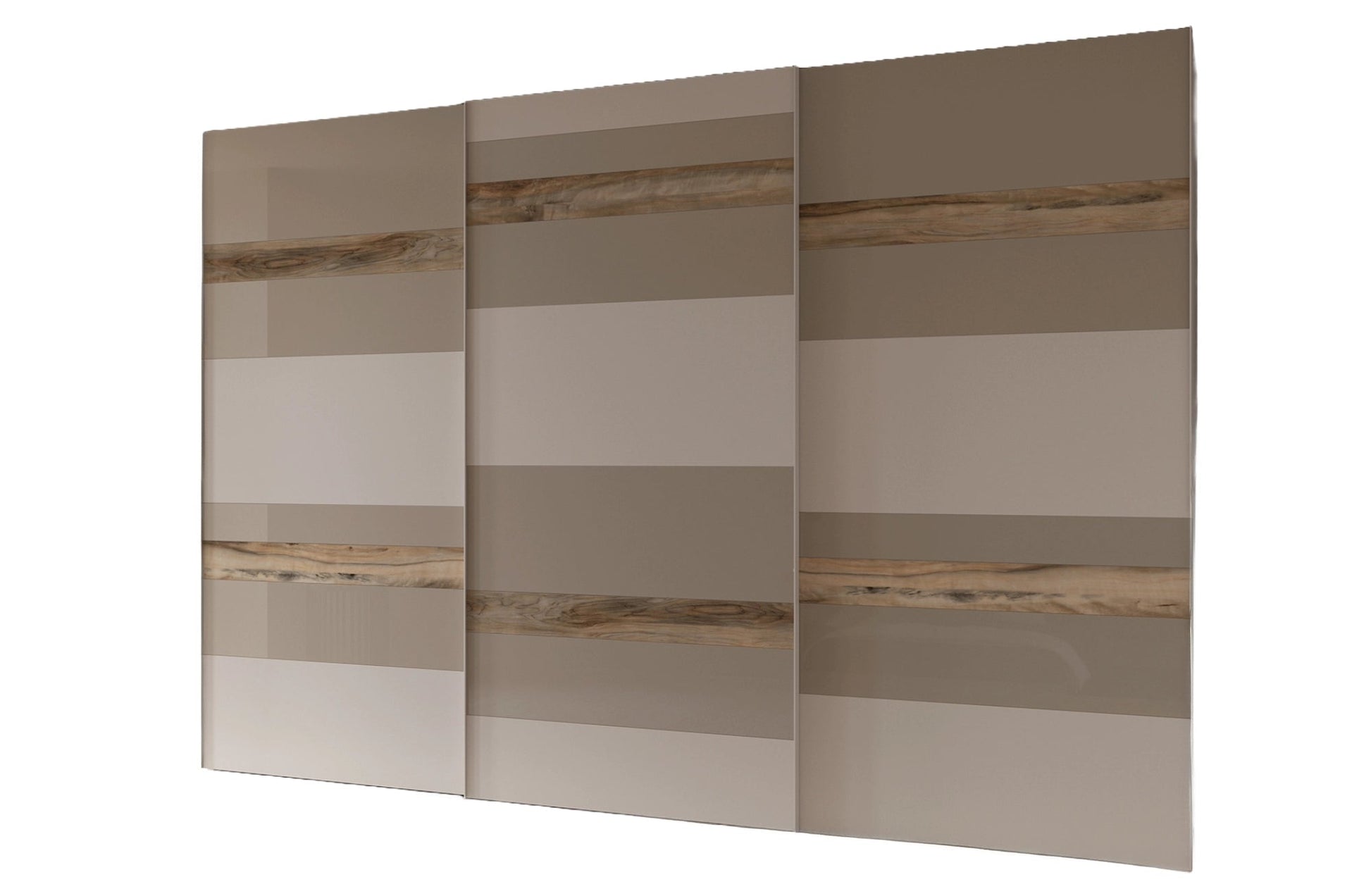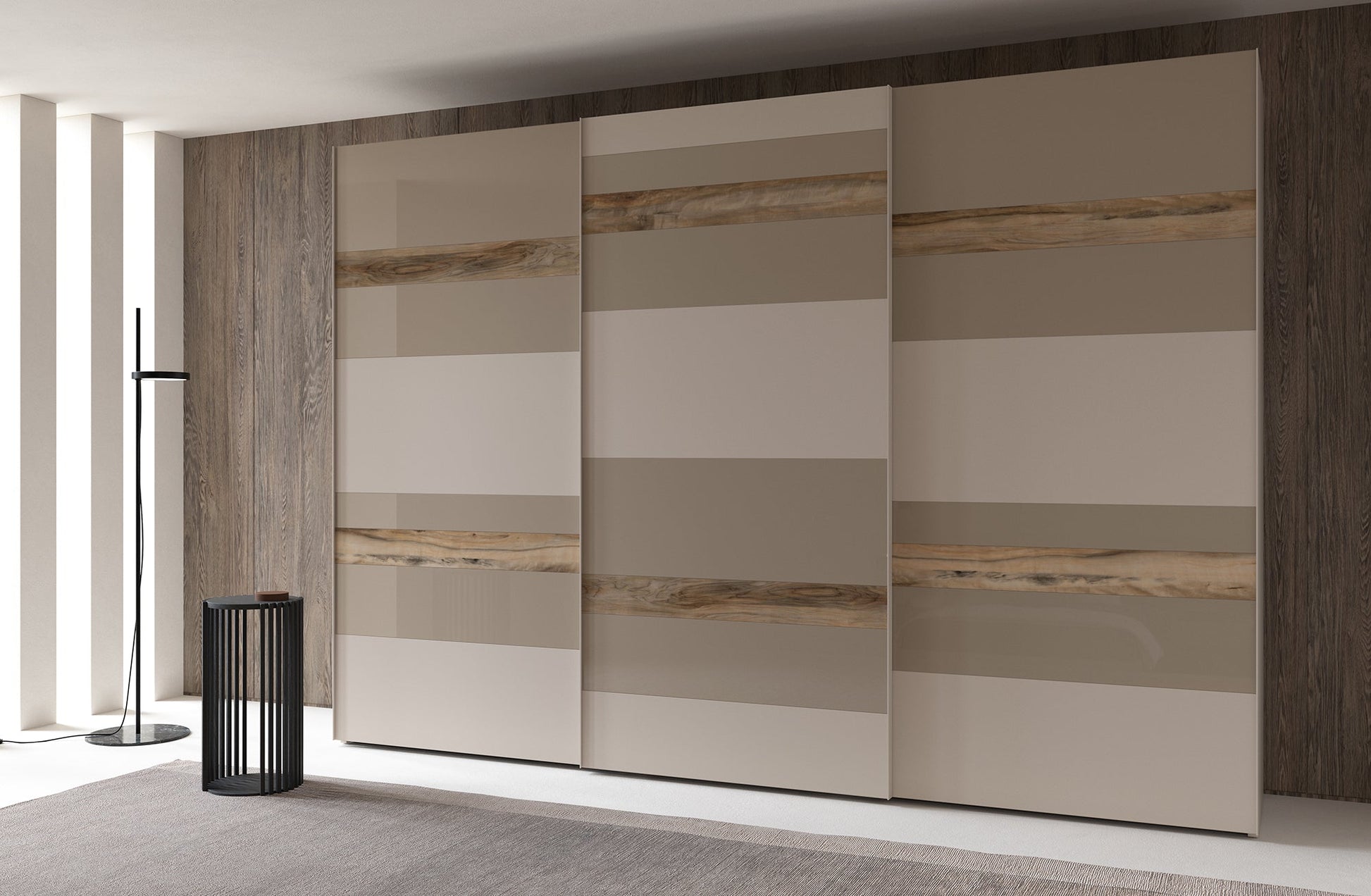 De larges bandes horizontales de différentes hauteurs alternent dans les finitions laquées mates Beige et Cachemire, Érable Fossile et verre laqué Beige.