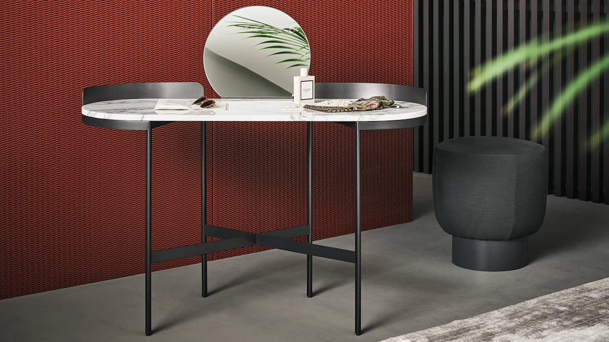 Le modèle Asia est un accessoire d'ameublement polyvalent, qui d'un bureau moderne peut également se transformer en vanité grâce à l'ajout d'un miroir. Le plateau aux lignes rondes peut être en marbre ou en céramique, tandis que la base est en métal. L'idée est une synthèse de forme et de fonction, un raffinement stylistique qui s'exprime à travers un engagement quotidien en faveur de l'harmonie.