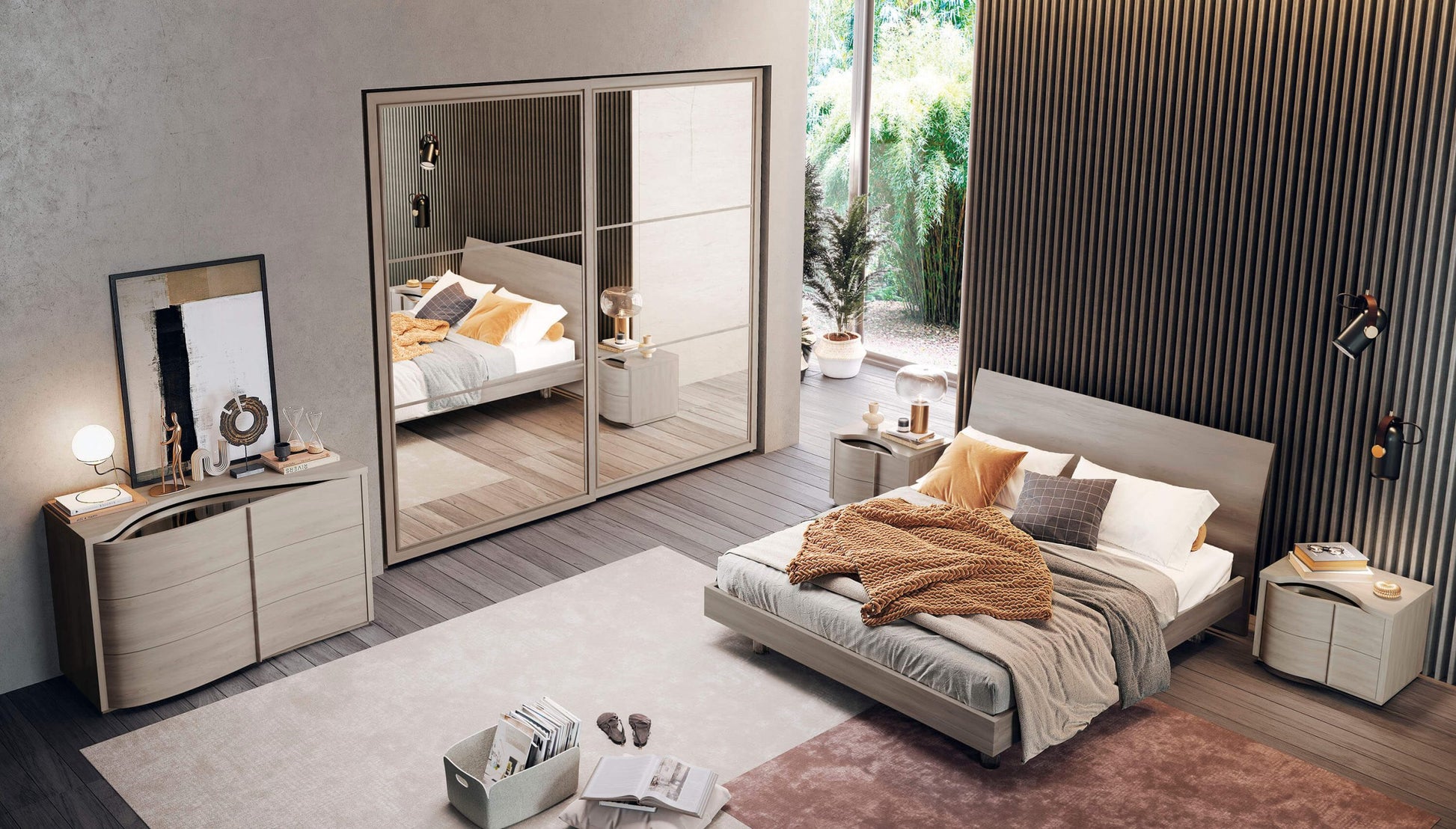 Camera completa Apollo GDO 415 con armadio battente ed armadio maxi: in bianco e canapa frassinato ed olmo ossido.