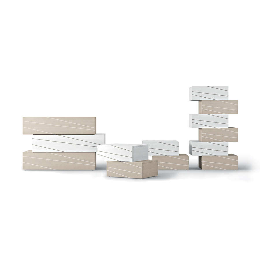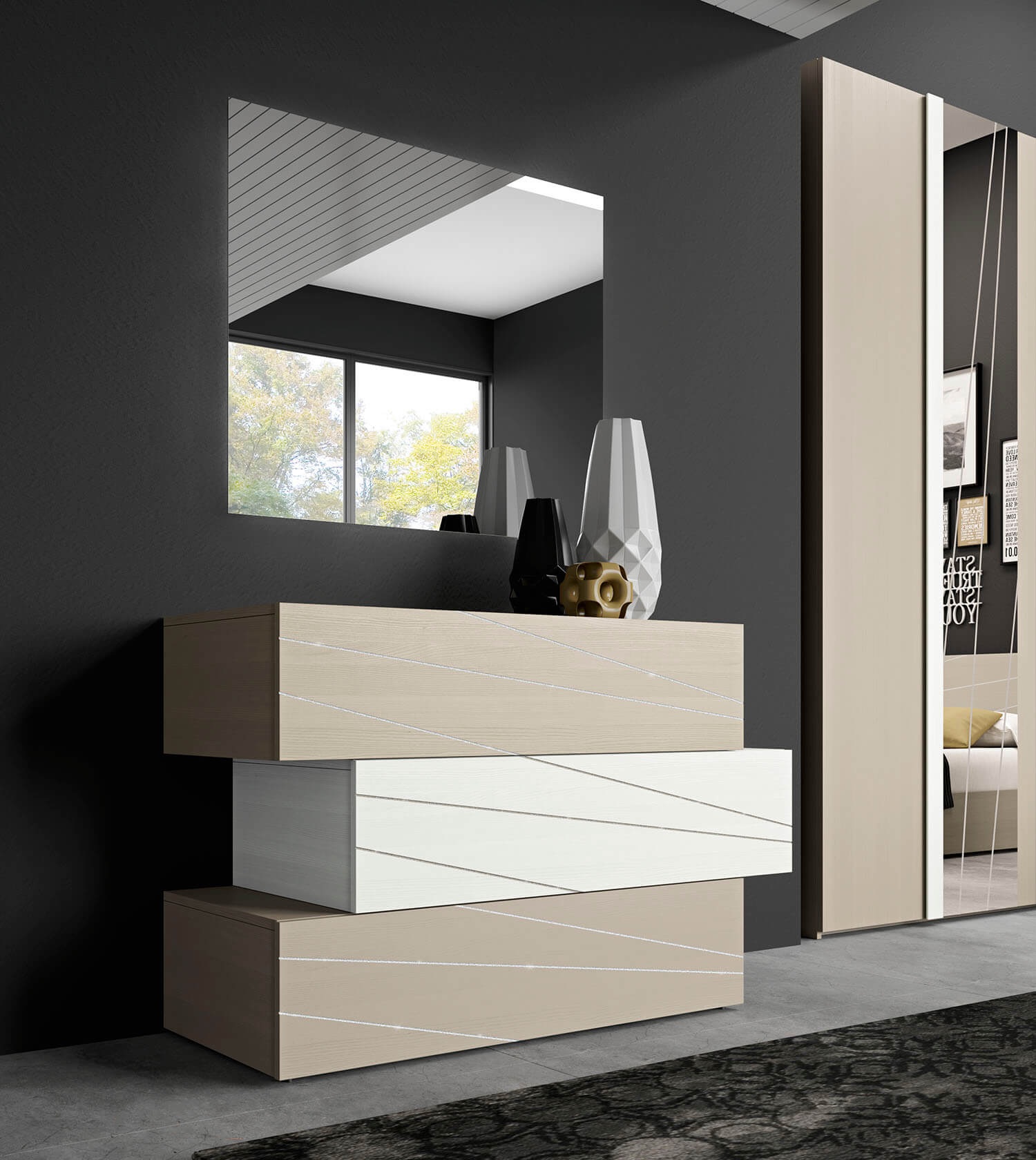 Comò 3 cassetti composto da elemento canapa frassinato con glitter BonBon bianchi + elemento bianco frassinato con glitter BonBon canapa. Dimensioni: 111+15 x 51 x 81 H cm.