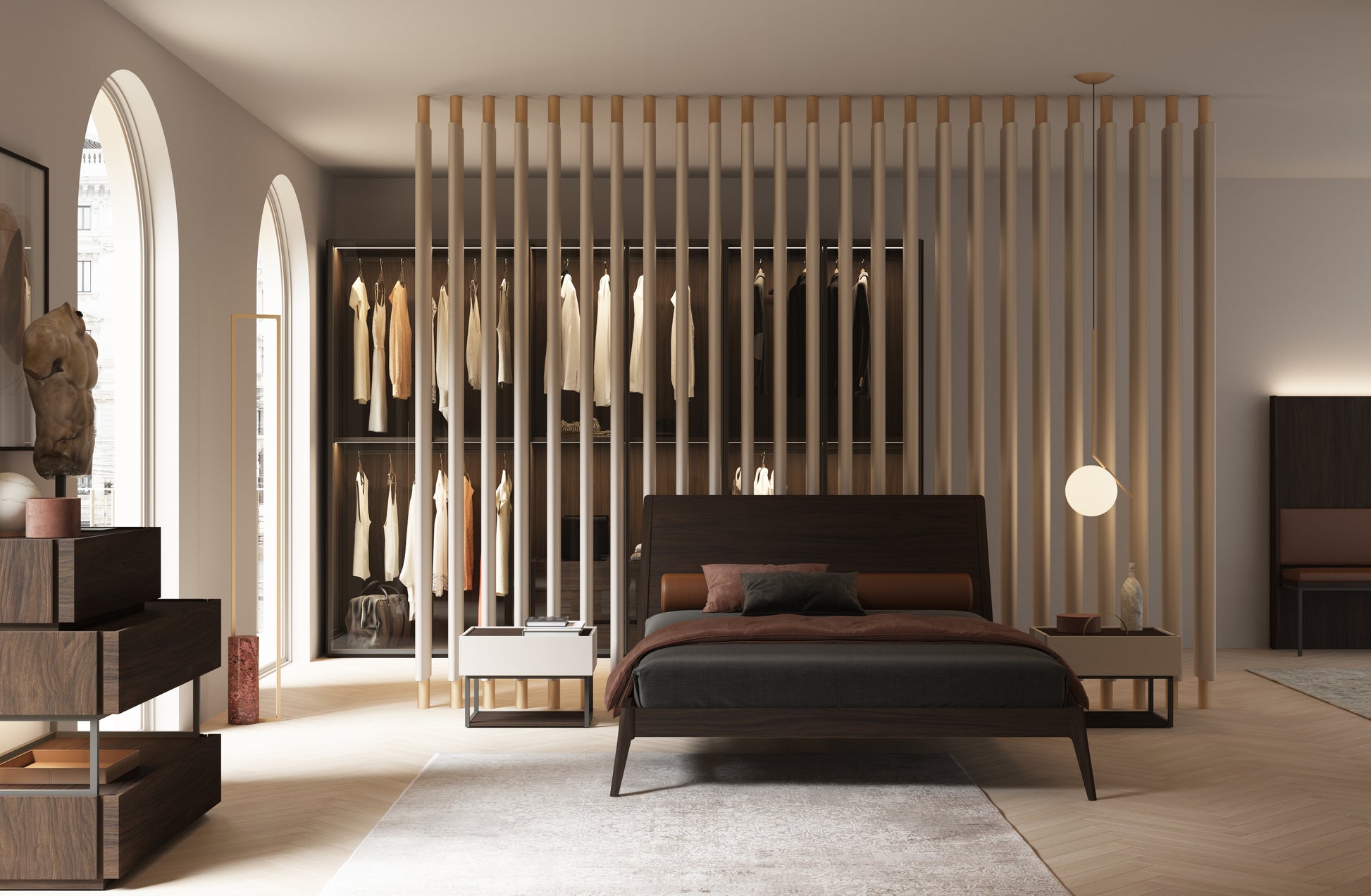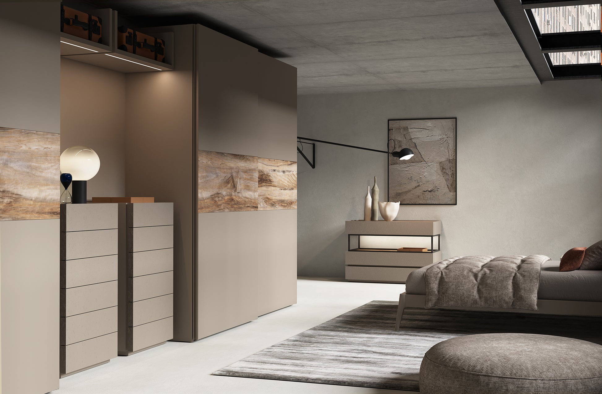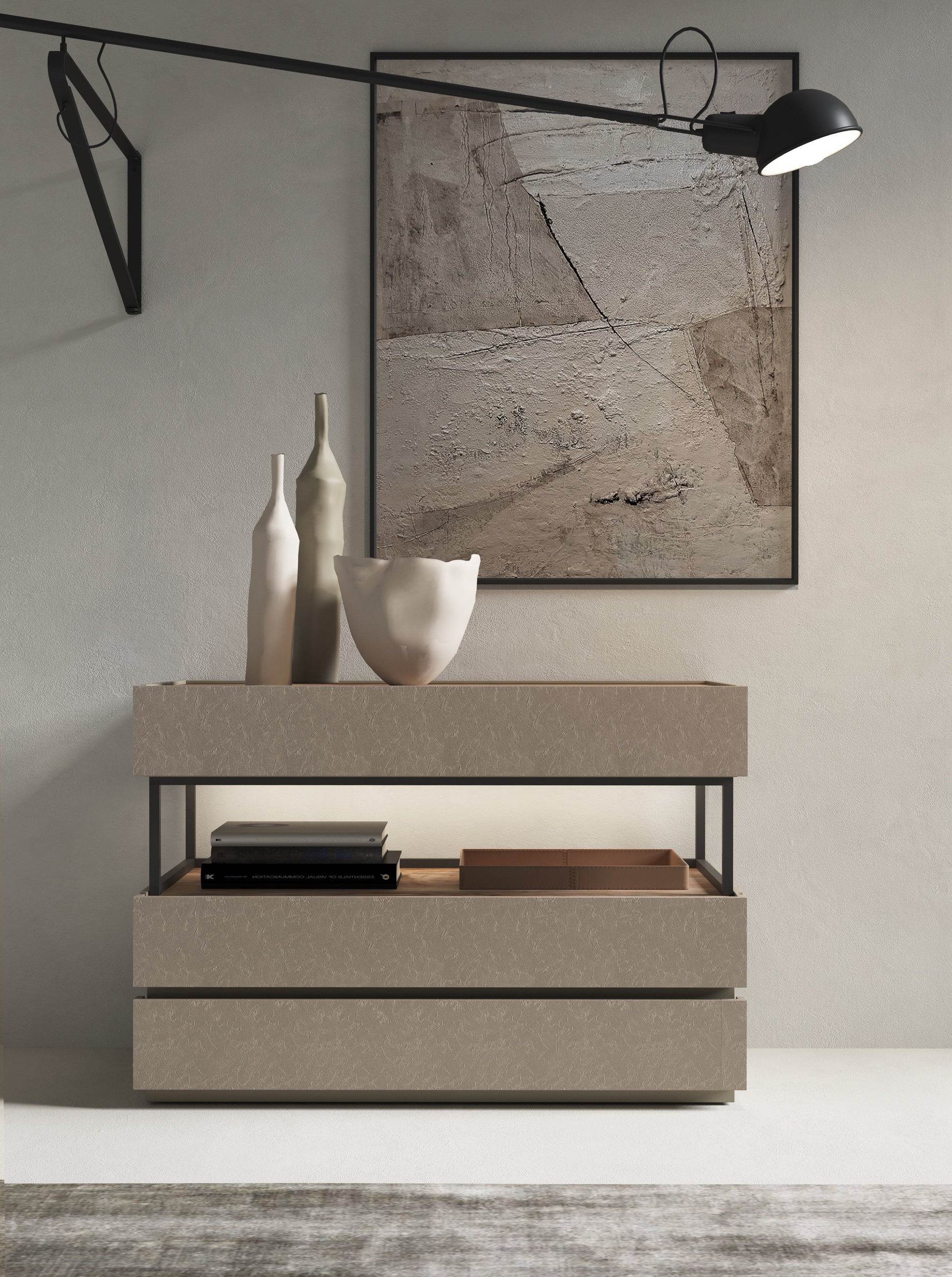 La commode Kalos est ici composée d'une série de conteneurs interrompus par un cadre en satin qui fait office d'élément ouvert.