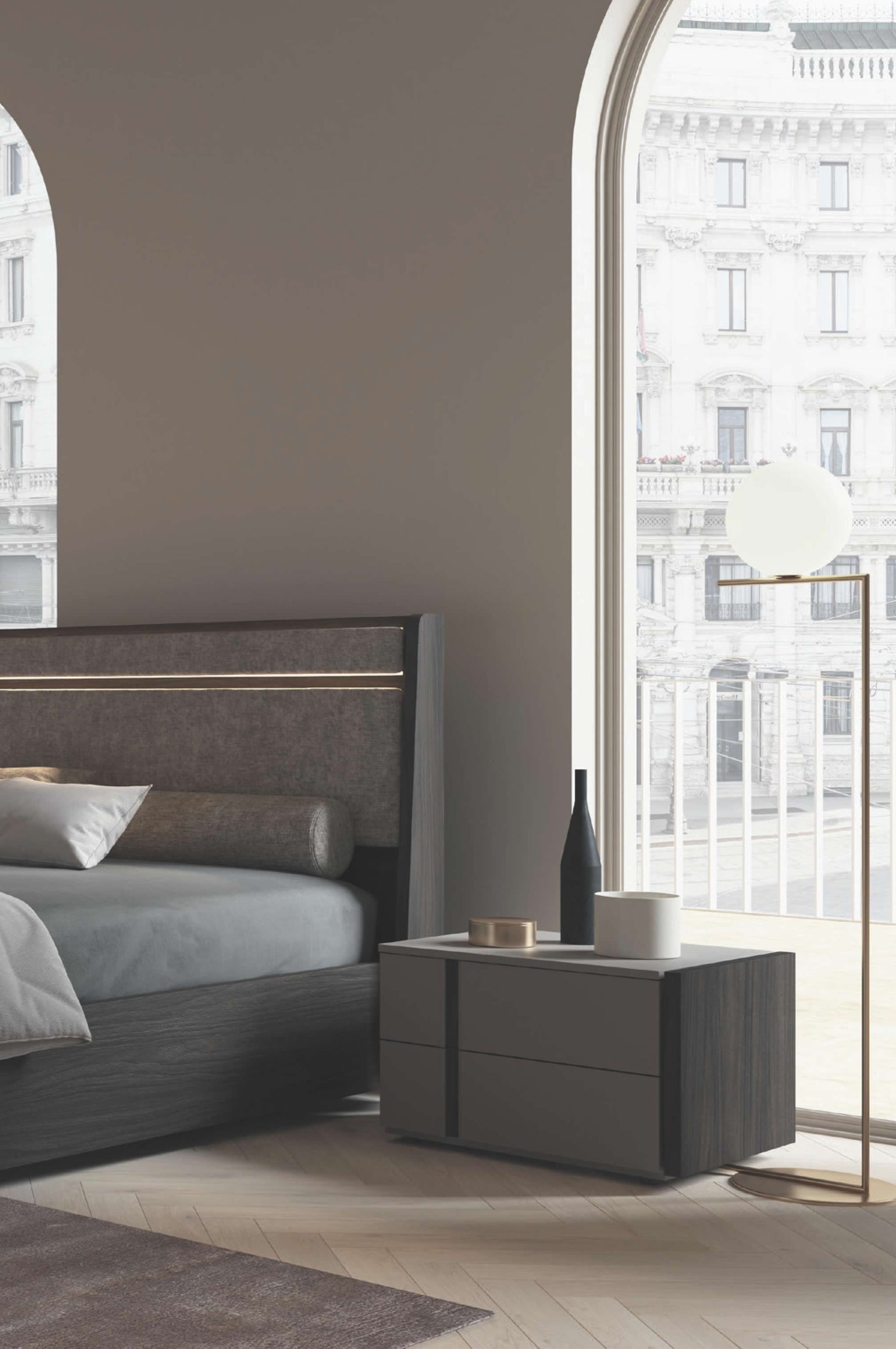 Les tables de chevet Vision avec poignée verticale sur les façades sont laquées Avio et personnalisées avec un panneau latéral en finition contrastée Noce Malizia.