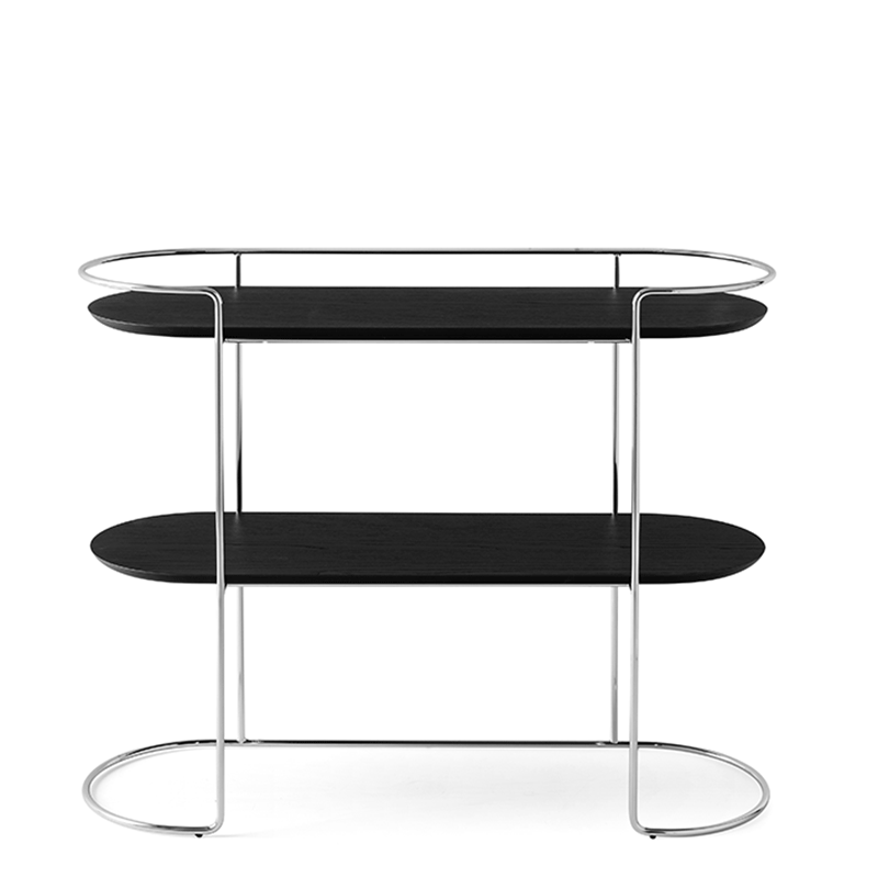 Consolle con piano ellittico e con fusto in metallo verniciato, piano superiore e inferiore impiallacciato o in ceramica. ATOLLO è la consolle a muro realizzata in tondino di metallo dalle forme arrotondate, stabile e versatile.