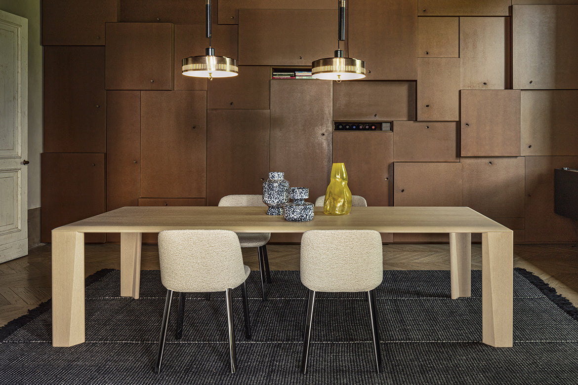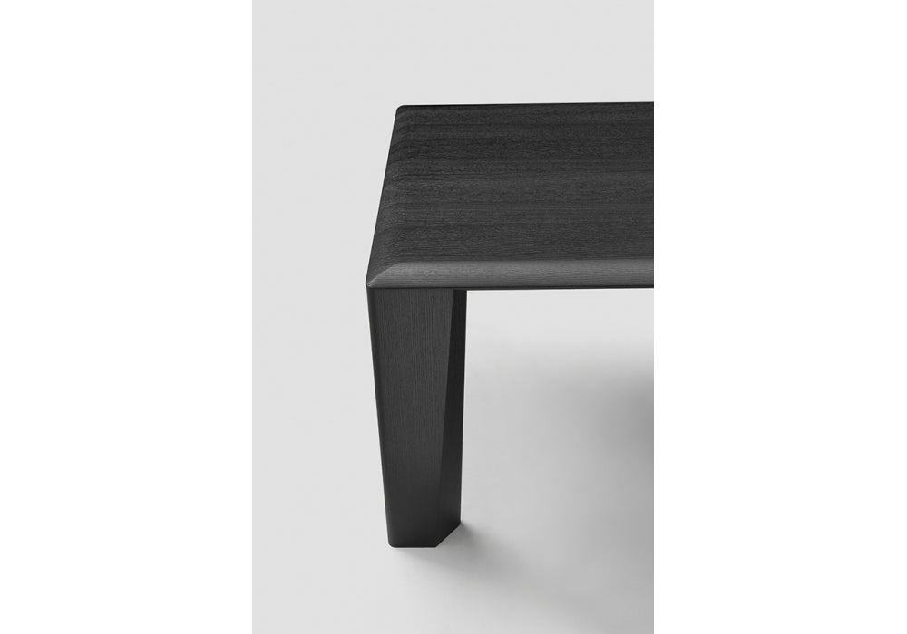 Dynamisme et tension. Entièrement réalisée en bois, la table Enea se distingue par ses géométries particulières qui mettent en valeur son design et sa matière. Le plateau est caractérisé par un bord façonné biseauté à 45° : le travail particulier du revêtement permet au grain du bois d'envelopper chaque côté, dans une continuité matérielle et visuelle qui souligne et met en valeur l'effet de pli et la plasticité apparente des surfaces. Les pieds, créés à partir d'une figure façonnée recouverte de placage de bois, naissent d'un processus similaire au pliage : le résultat est un pied iconique et caractéristique, souligné par le grain du bois.