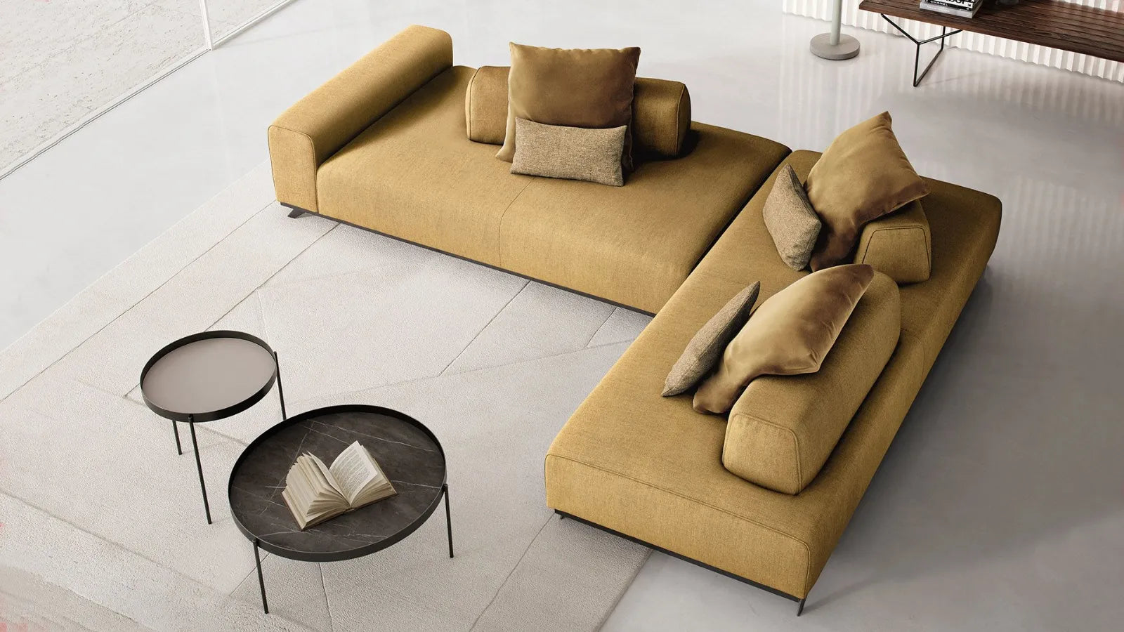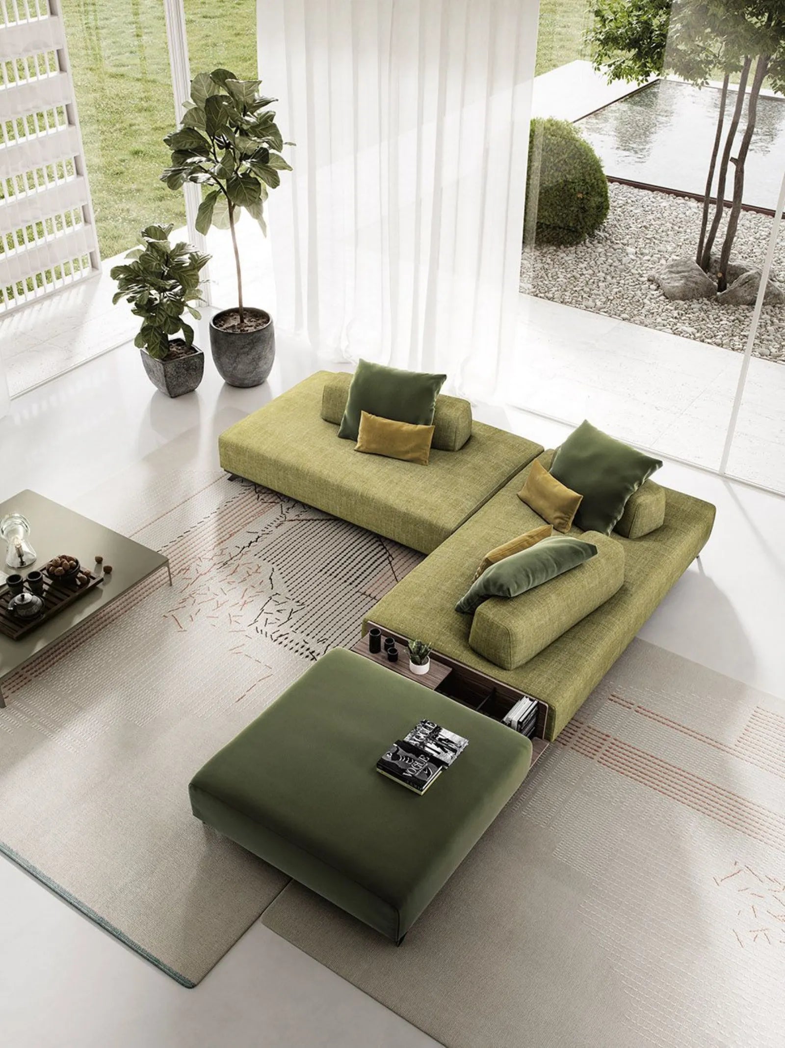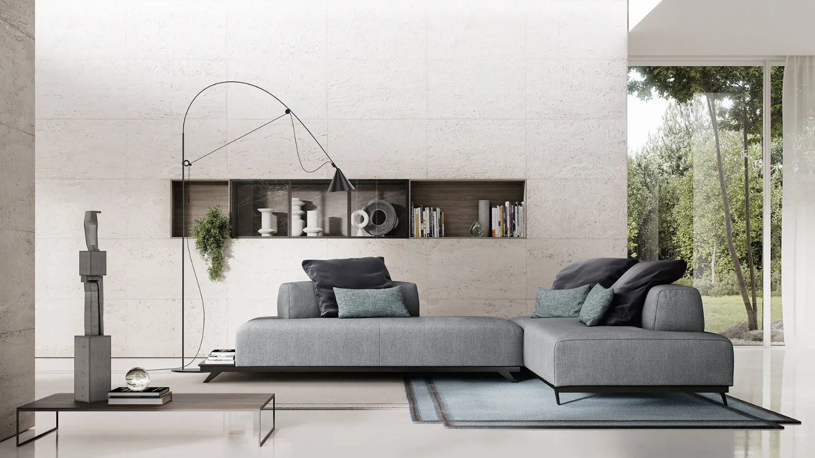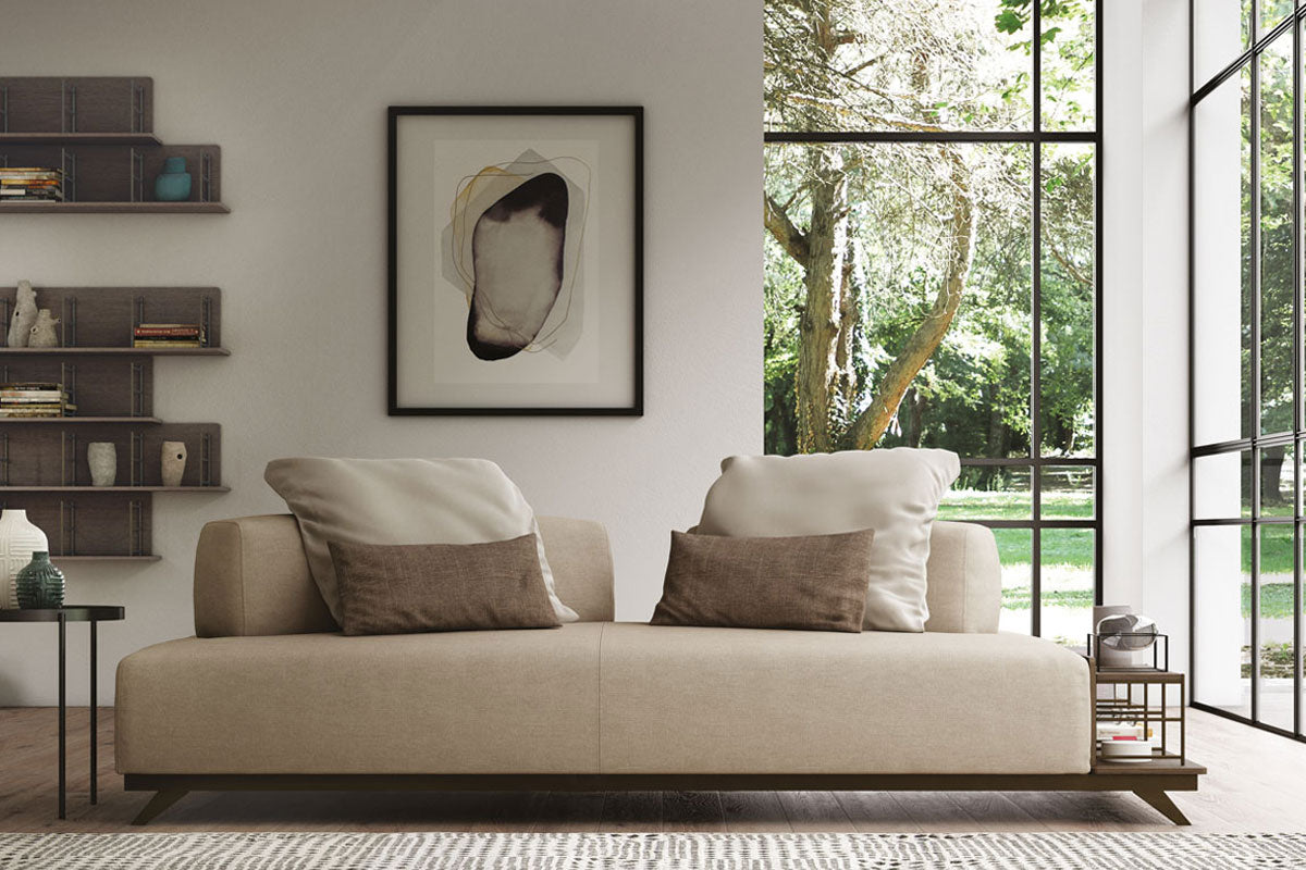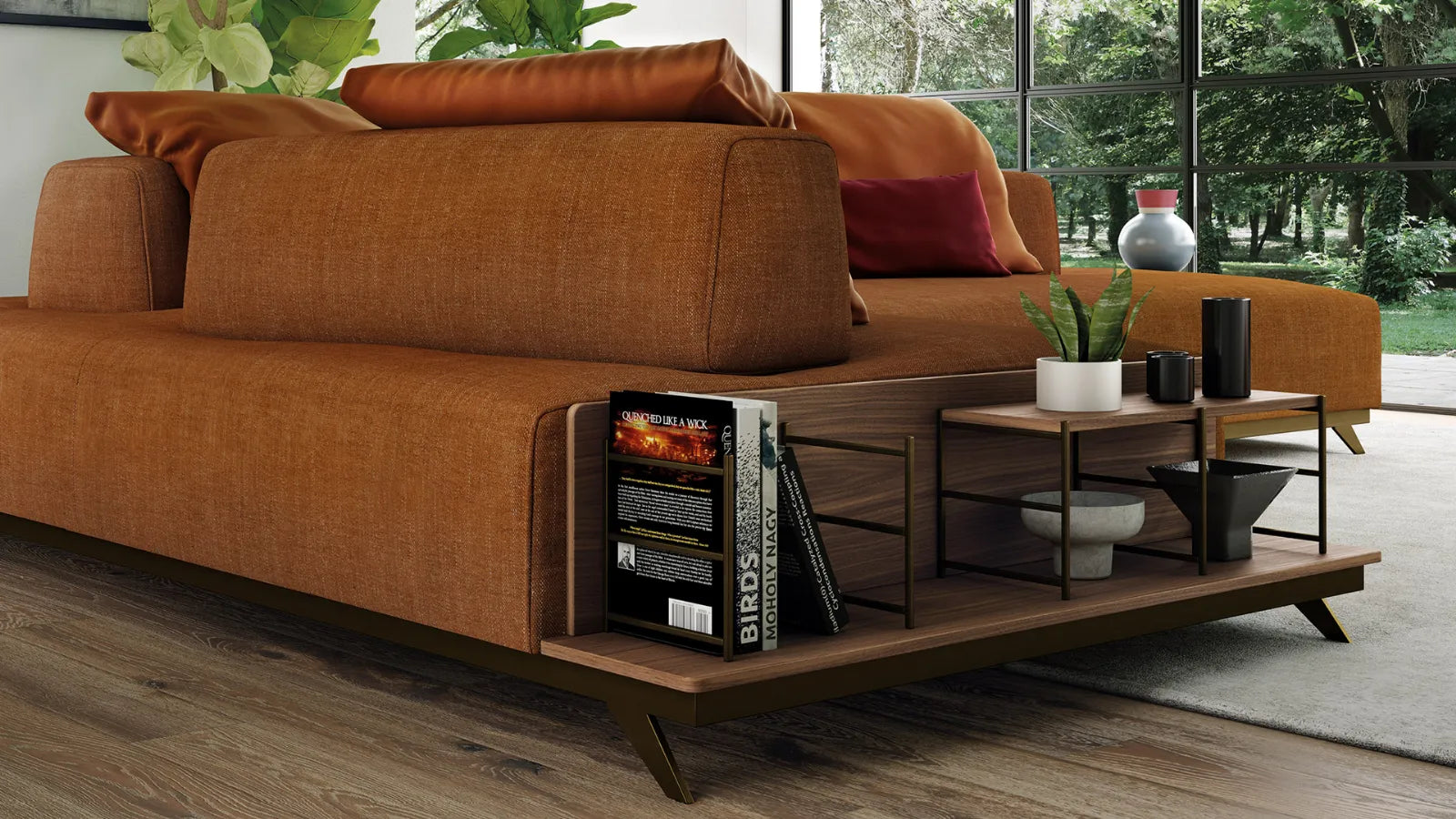 Le canapé devient une œuvre d'ameublement unique et originale, moderne et fonctionnelle à la fois. L'intégration d'éléments accessoires tels que des étagères et des bibliothèques en bois et la possibilité de combiner différents matériaux comme le tissu et le cuir constituent un niveau supplémentaire de personnalisation.