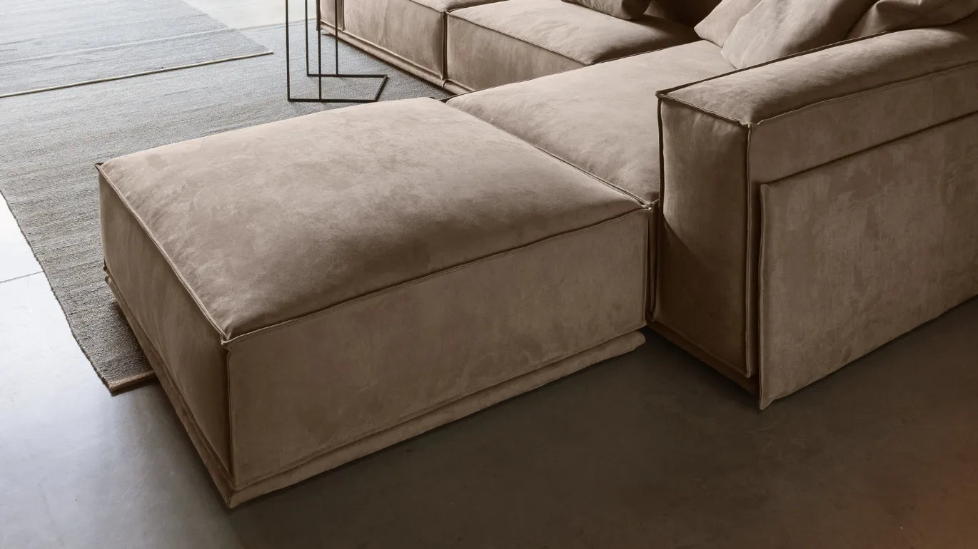 Roland peut être composé de manière créative, grâce aux nombreux éléments disponibles, de la péninsule aux grands poufs, en passant par l'important coussin/accoudoir parfaitement aligné avec le dossier ou en utilisant la version plus minimale de l'accoudoir léger.