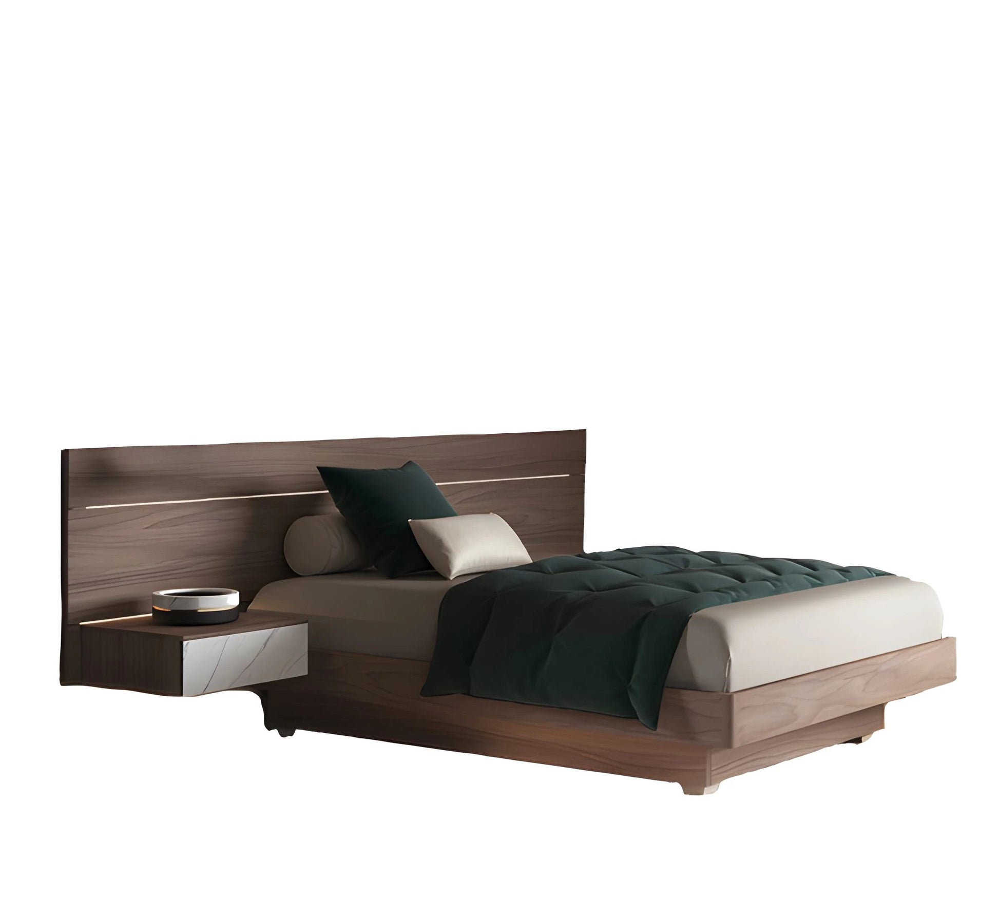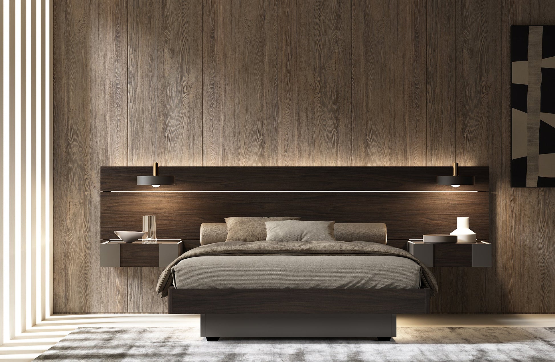 La tête de lit du lit Cartesio est composée de lattes horizontales en Érable Fossile et laque Terra mate montées sur un panneau arrière fixé au mur qui, en plus d'avoir un effet esthétique particulier, servent de support aux éventuelles étagères métalliques, LED et tables de chevet proposées ici dans la ligne Best dans les mêmes finitions que la tête de lit. Le cadre de lit et le conteneur encastré inférieur sont laqués Terra mat.