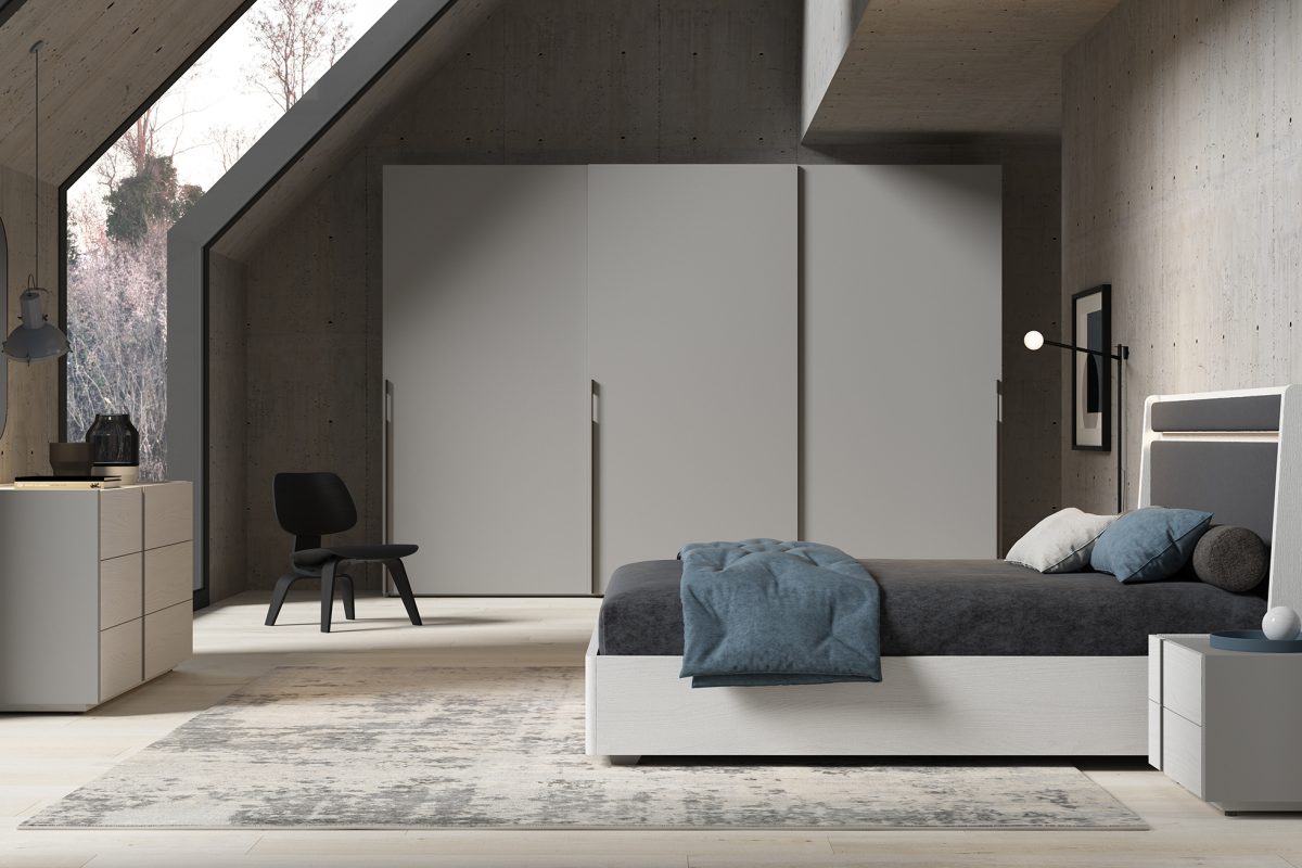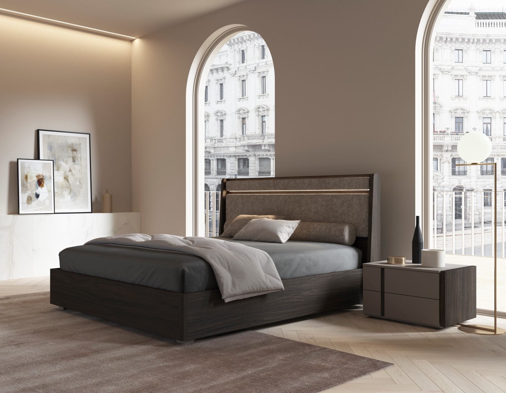 Image 2. Le lit Hug, grâce aux bandes lumineuses intégrées à la tête de lit, est mis en valeur dans son style sobre mais élégant par le cadre fini avec des panneaux latéraux façonnés en Bois de Tabac M848 et par des coussins confortables en tissu Repose 363. Le Vision laqué mat les tables de chevet Gianduia F110 avec le panneau latéral et l'insert de poignée découpée verticalement dans la même essence que le lit, en plus de créer un espace coordonné, font de la chambre un environnement plus intime et accueillant.