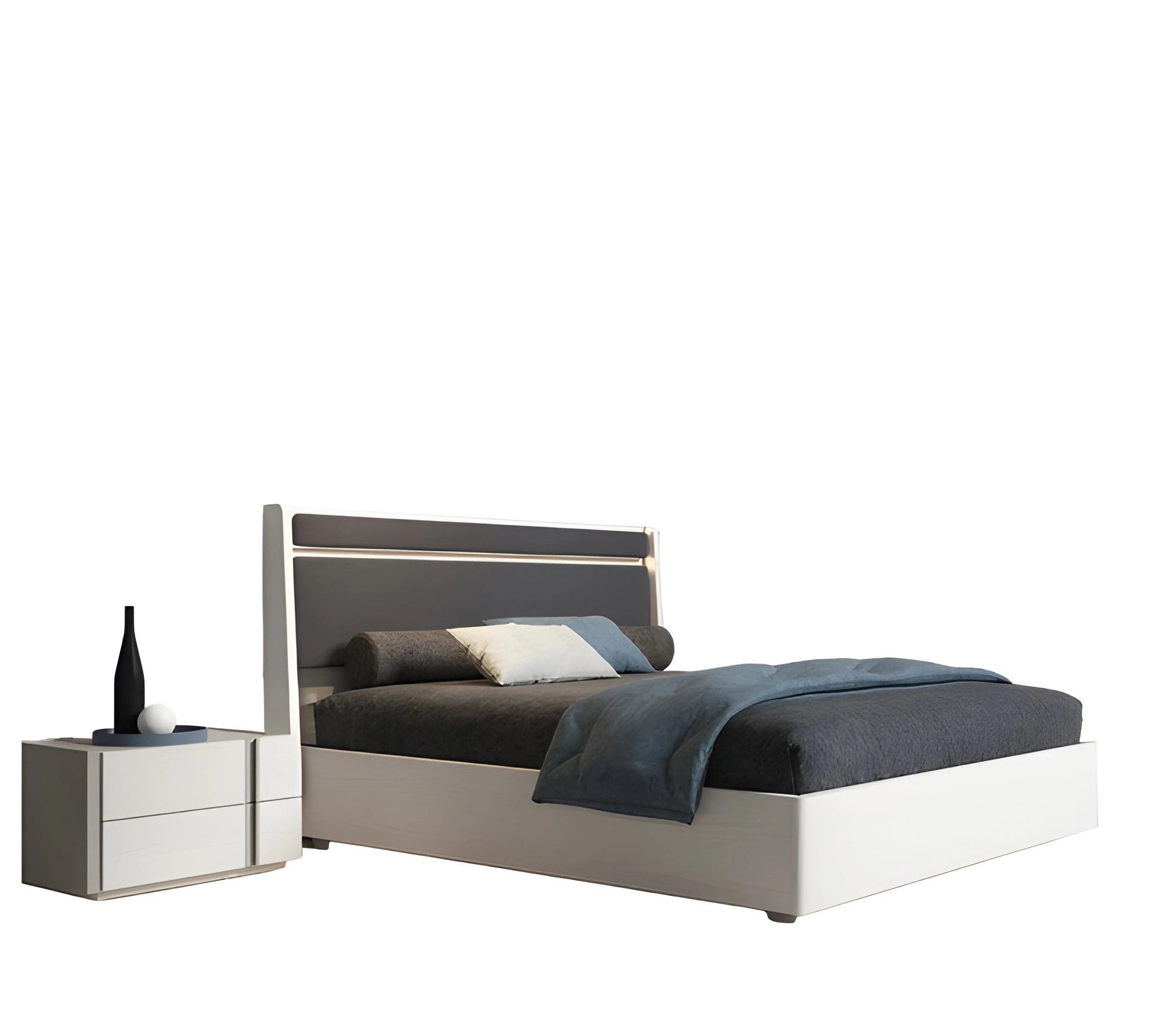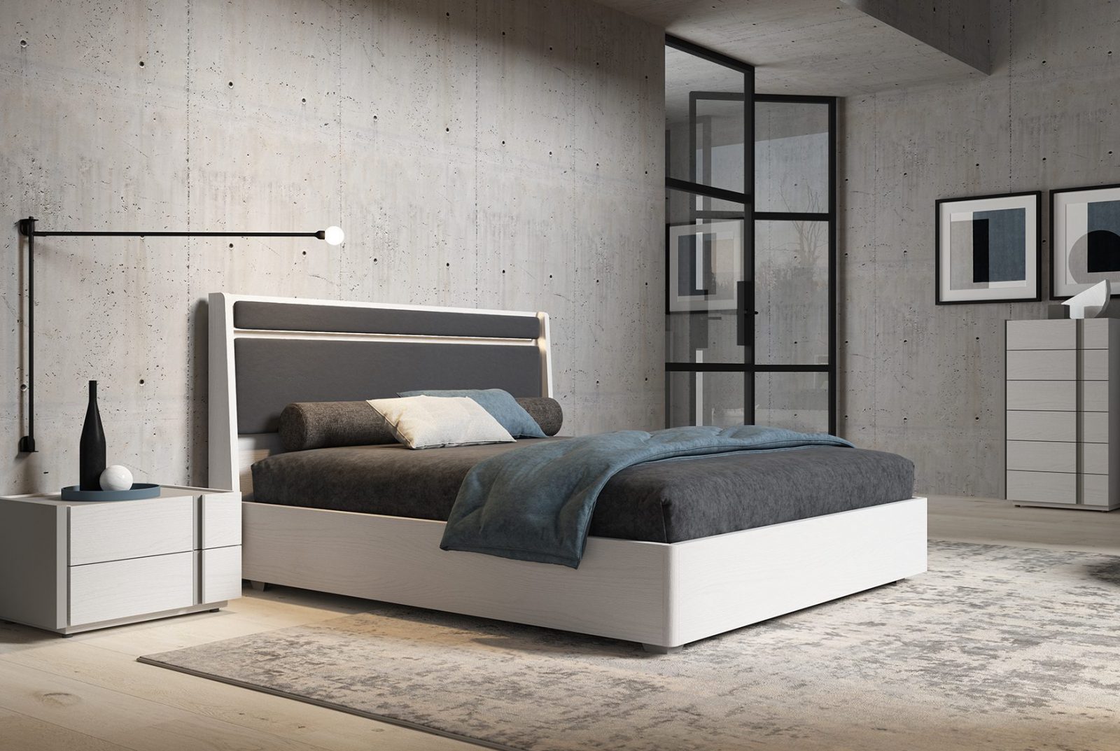 Le lit Hug est mis en valeur par le cadre doté de panneaux latéraux profilés et de coussins confortables éclairés par des bandes LED intégrées.
