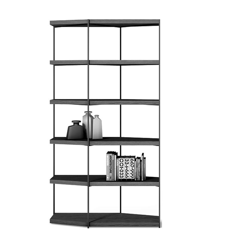 Libreria a giorno con fianchi in metallo e ripiani in legno sagomati, spessore 4 cm.