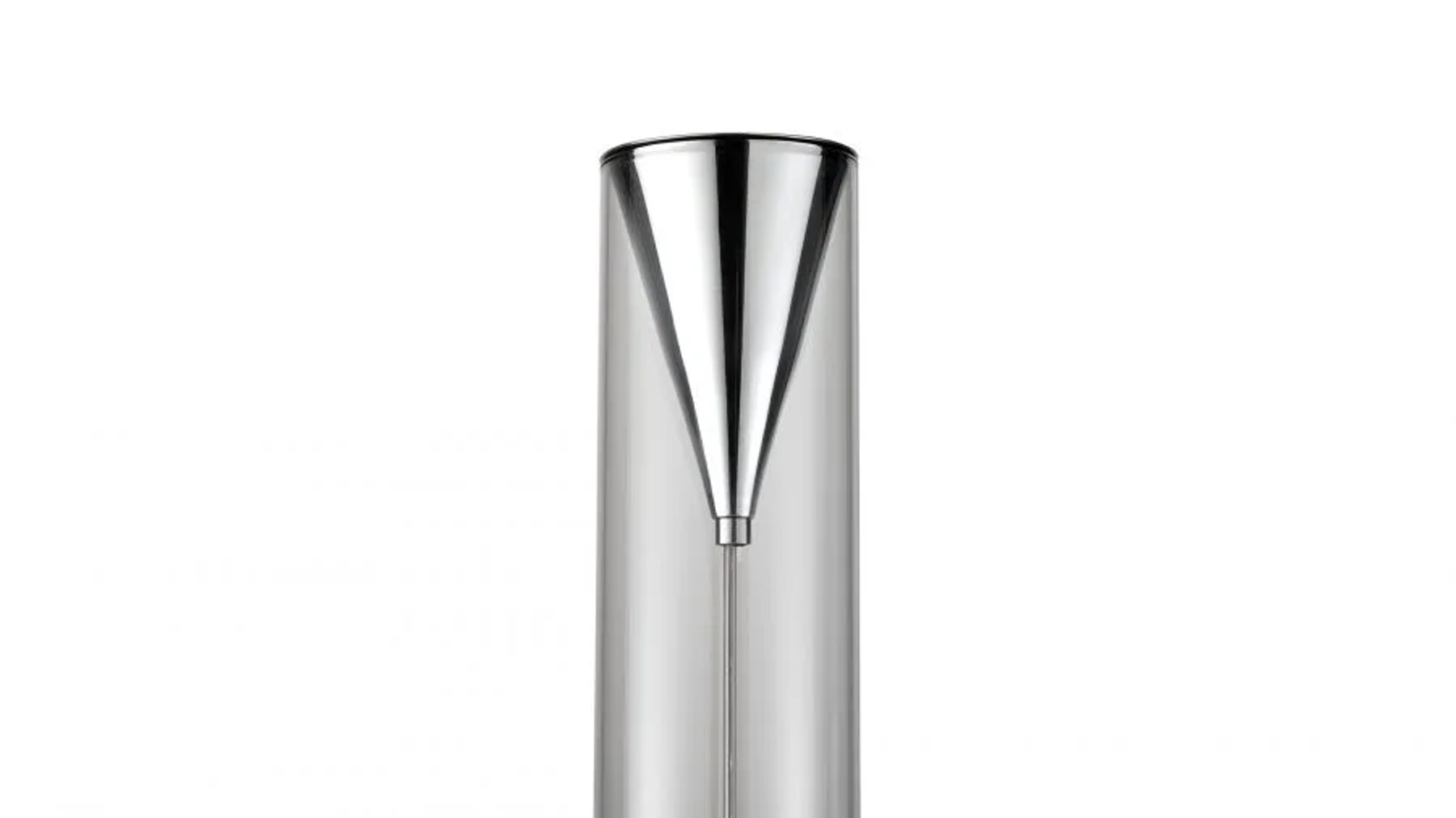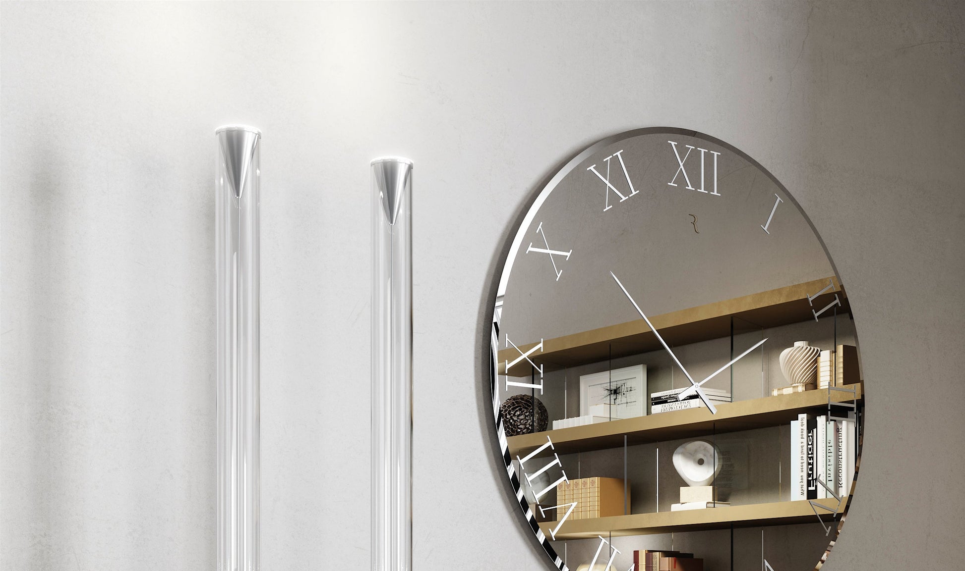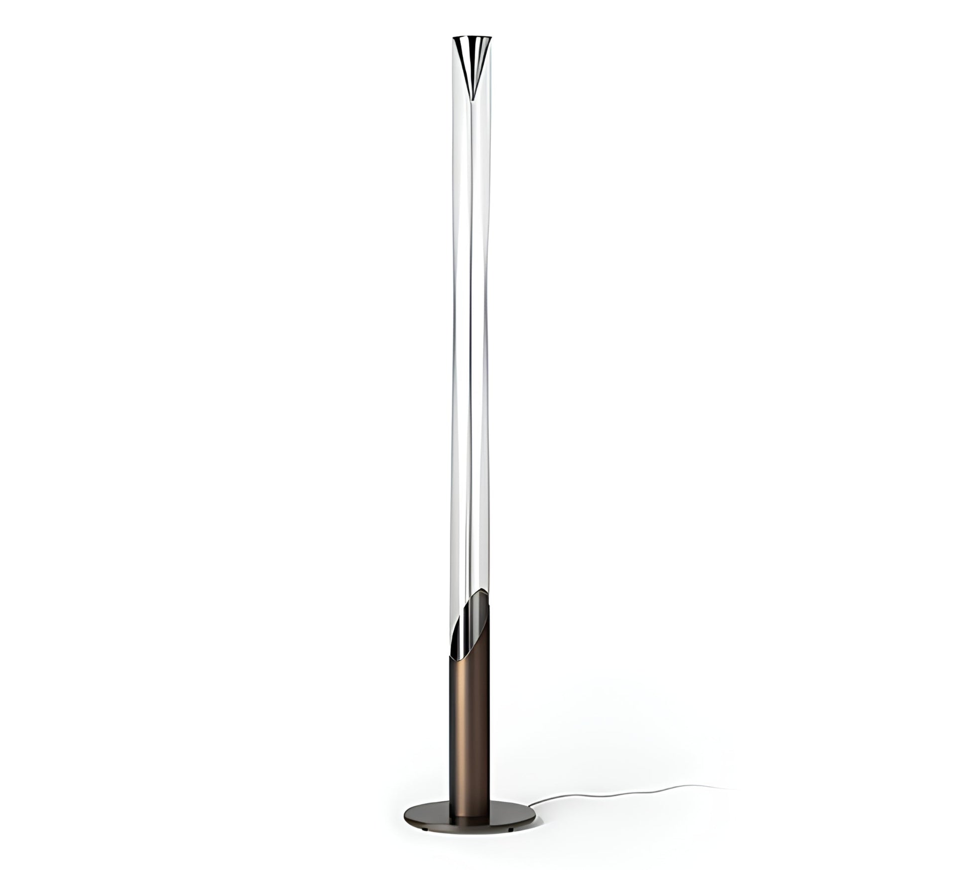 Lampadaire en verre borosilicaté transparent avec support en aluminium chromé. Également disponible en version verre teinté blanc avec double point lumineux.Système d'éclairage LED.