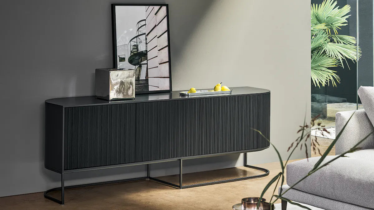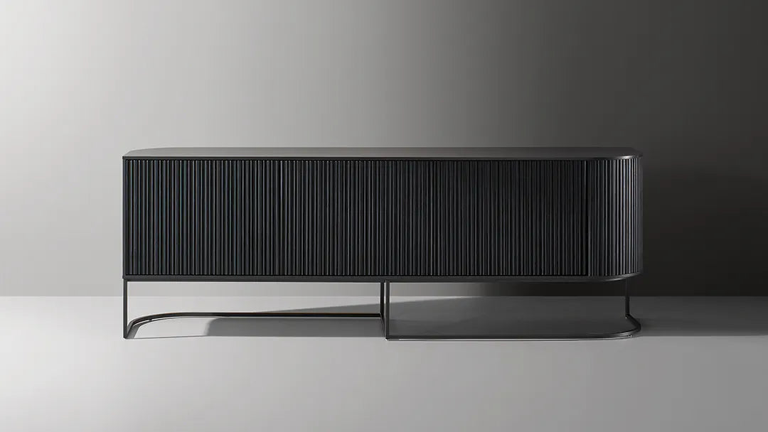 Les portes d'entrée en bois se caractérisent par une surface ondulée qui crée une succession de lumière et d'ombres, tandis que la base en métal se développe de manière asymétrique et met en valeur l'horizontalité du buffet. Dune est un buffet moderne en bois au caractère rigoureux, extrêmement élégant et soigné dans les moindres détails. Un élément qui s'intègre parfaitement aussi bien dans une maison privée que dans un bureau. Le buffet Dune est disponible en deux combinaisons de couleurs différentes : structure extérieure en bois laqué bronze, portes en noyer Canaletto et base en métal couleur bronze ou structure extérieure en bois laqué plomb, portes en chêne carbone et base en métal couleur plomb.