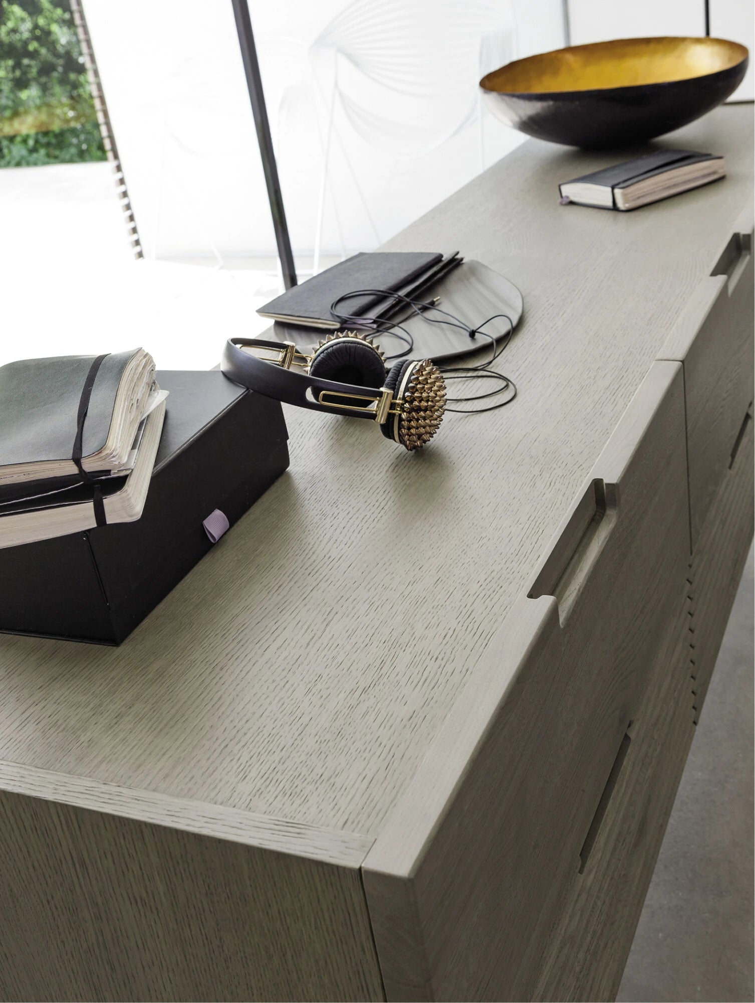 Les lignes asymétriques et les effets de couleurs ton sur ton sur les façades définissent un langage original au goût universel. Dotée d'une personnalité forte et innovante, cette variante du buffet Zero.16 a le style qu'il faut pour laisser sa marque.