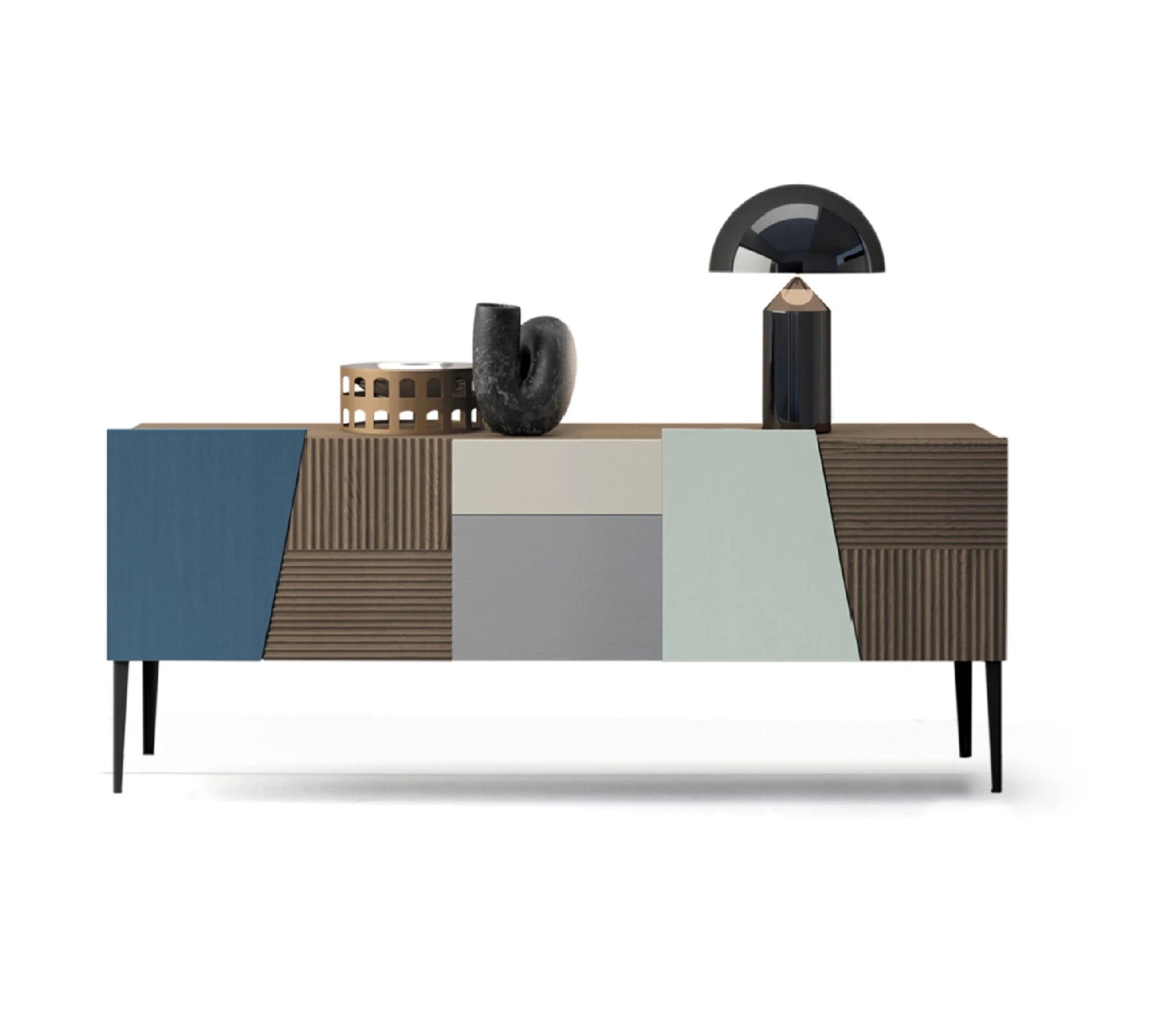 Des couleurs différentes soulignent à chaque fois les géométries modernes des façades, tandis que la texture et la couleur naturelle du bois ressortent des finitions plus élaborées. Spacieux et pratique, ce meuble de rangement remplit sa fonction de manière dramatiquement esthétique.