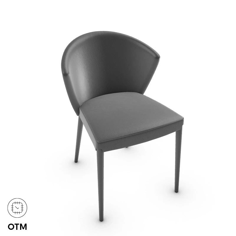 Sedia in metallo completamente rivestita. Fusto in tubo conico Ø14/20x1,5 mm. Seduta e schienale con imbottitura in poliuretano espanso 40 kg/m3. Supporto schienale e sedile in multistrato da 12 mm, seduta con struttura a cinghie elastiche.