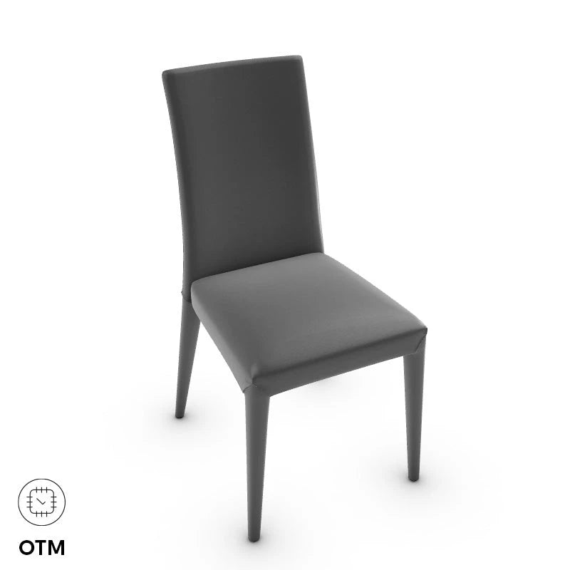 Sedia con struttura in legno massello completamente rivestita. Seduta e schienale con imbottitura in poliuretano espanso 40 kg/m3. Seduta con struttura a cinghie elastiche.