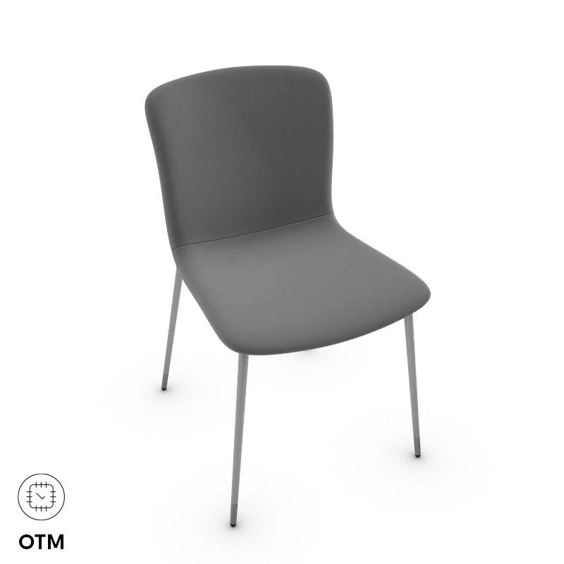 Sedia in metallo. Fusto in tubo conificato Ø20-14x2 mm. Scocca in multistrato da 10 mm con imbottitura in poliuretano espanso 40 kg/m3. Imbottitura senza trapuntatura. Piedini in nylon.