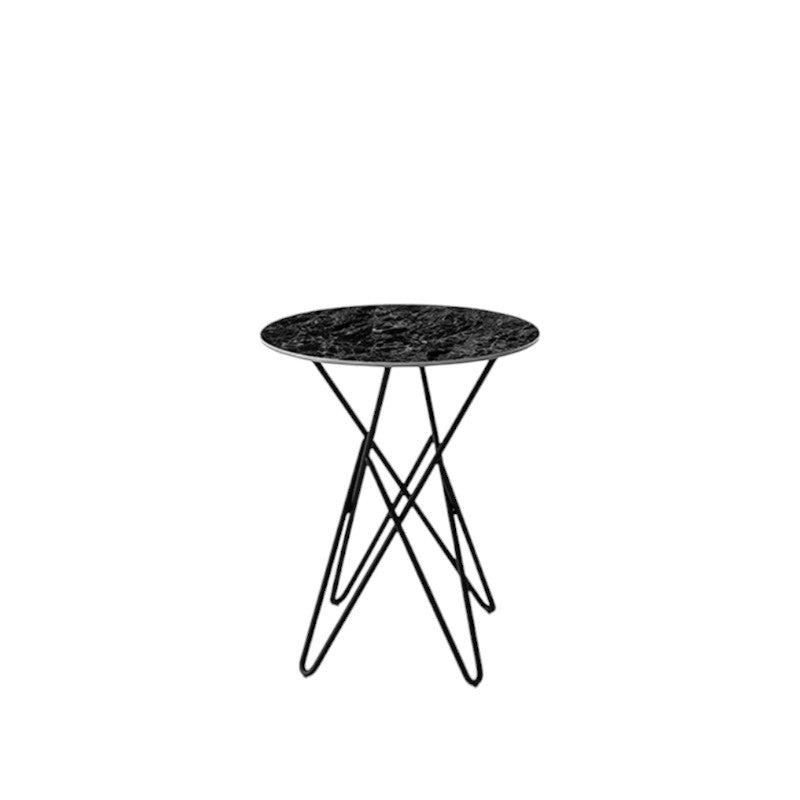 Tavolini con struttura in tondino di metallo disponibile in due altezze e due dimensioni di piano, in ceramica o legno.