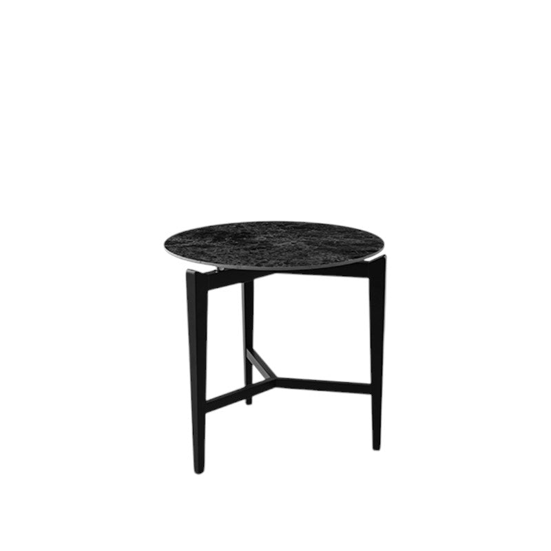 Tavolino alto modello SYMBOL, struttura in legno e piano rotondo. Basamento a 3 gambe.