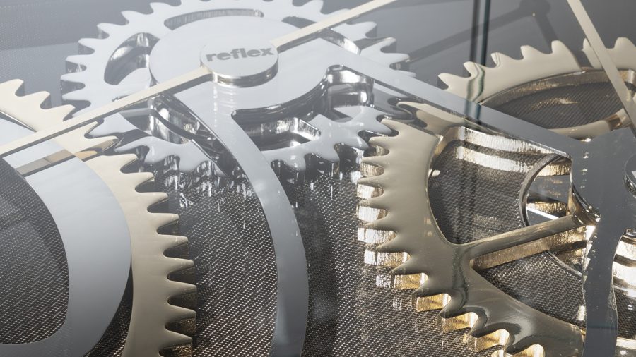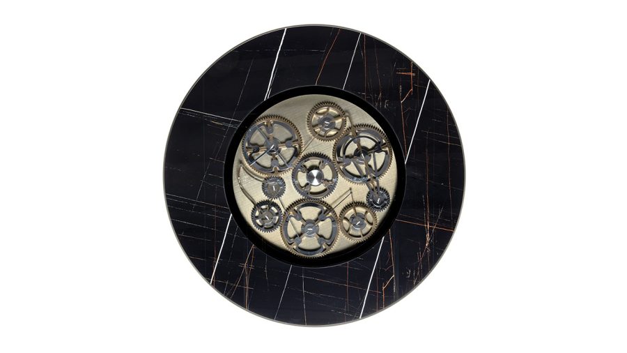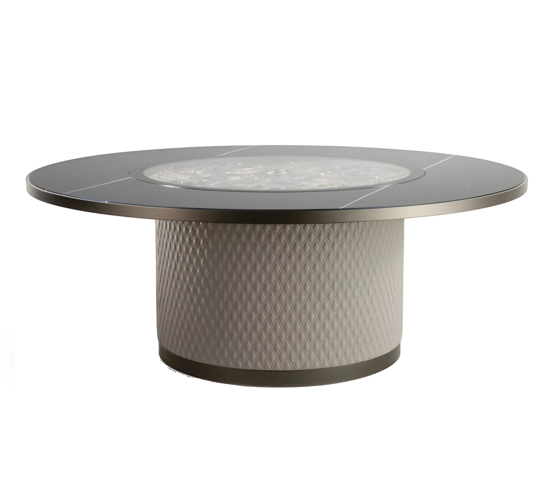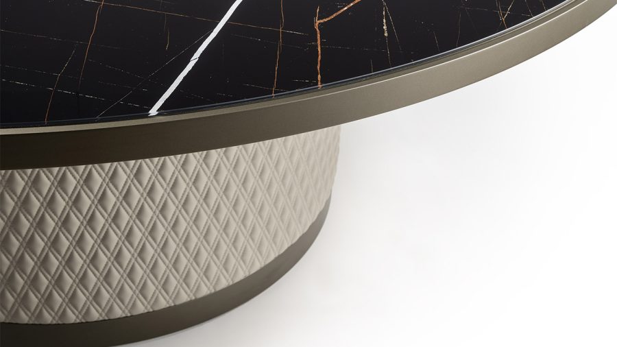 Table à manger avec 1 piètement cylindrique recouvert de cuir CAT.C ou NABUK avec matelassage. Plateau en bois de 40 mm d'épaisseur avec revêtement Marmoreflex/Legnoreflex. Bord du dessus et de la base du cylindre en finitions métalliques (Bronze (100M), laiton (104), laiton foncé (105M9, titane (101M). Lazy Susan intégrée dans du verre transparent avec engrenages dorés et chromés polis sur un fond en verre Mesh Moteur électrique en option pour le mécanisme Lazy Susan.