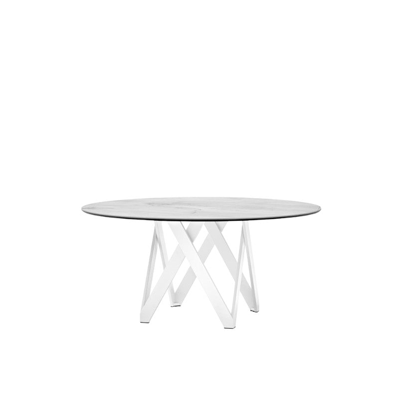CARTESIO è un tavolo dalla linea elegante e iconica caratterizzato da un'originale struttura portante in metallo verniciato e composta da 4 elementi a “V” di sezione rettangolare e indipendenti, con piano rotondo in ceramica.