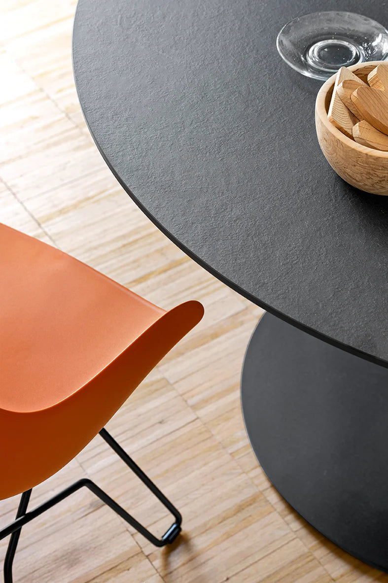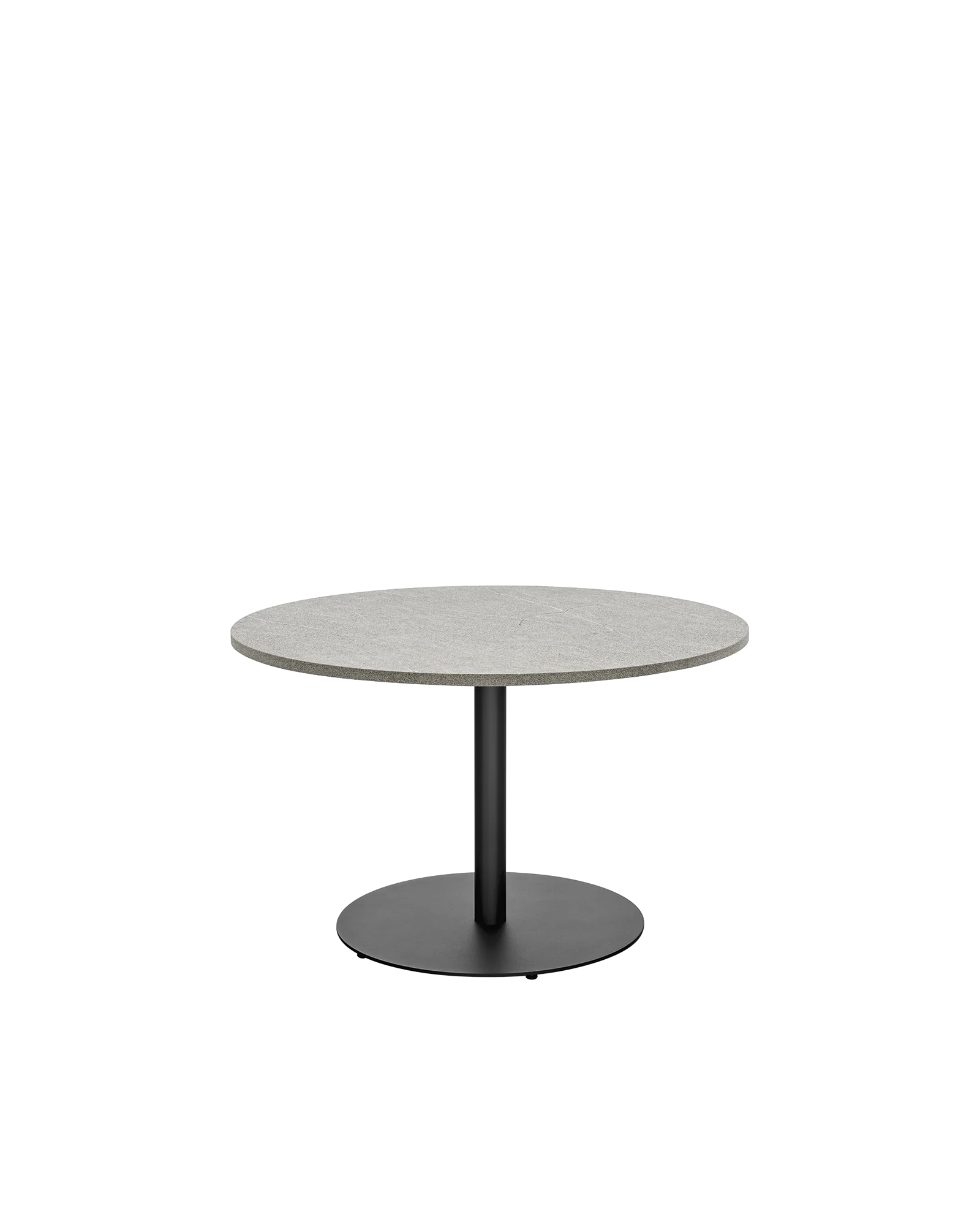 Table COCKTAIL en métal, avec pieds réglables. Idéal pour l'extérieur et les espaces lounge (version chromée non adaptée à un usage extérieur). Plateau rond en mélamine.