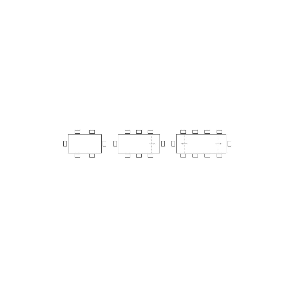 Il piano è allungabile grazie a un meccanismo di apertura guidato. Le gambe sono sempre perimetrali per garantire il massimo comfort a tutti gli opiti.