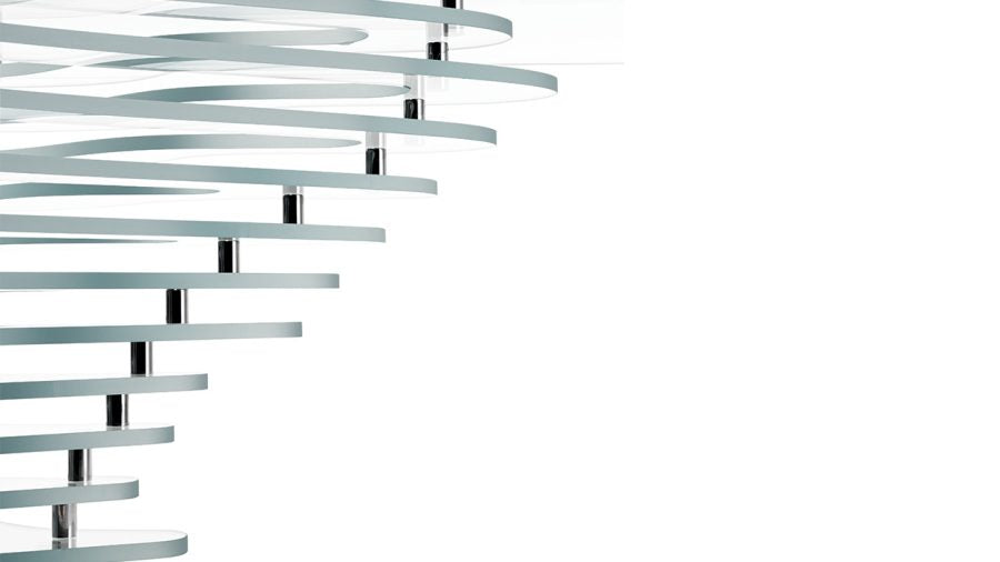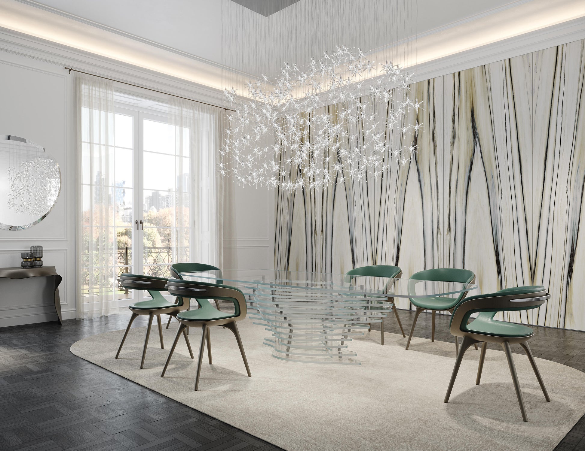 Table à manger avec base composée de couches superposées de verre extra-clair de 19 mm d'épaisseur. Plateau rectangulaire ou carré-rond en verre extra-clair.