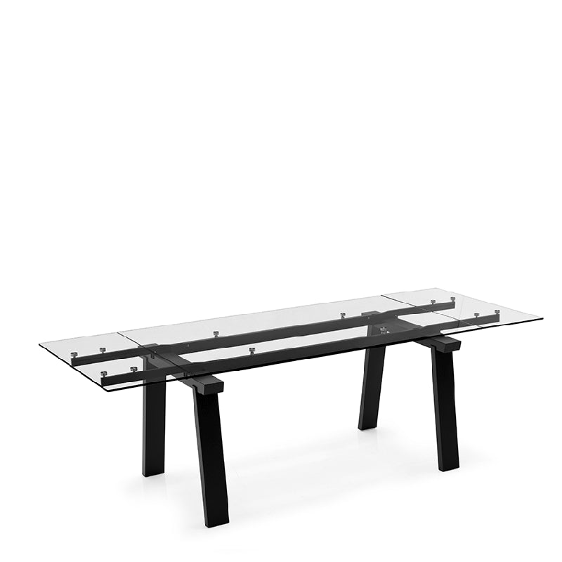 Tavolo LEVANTE con mix materico: base in legno, guide in metallo e piano in vetro.
