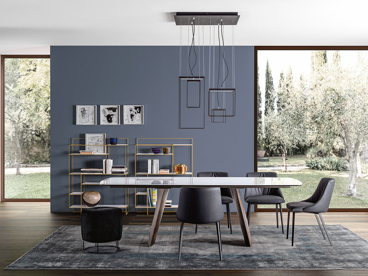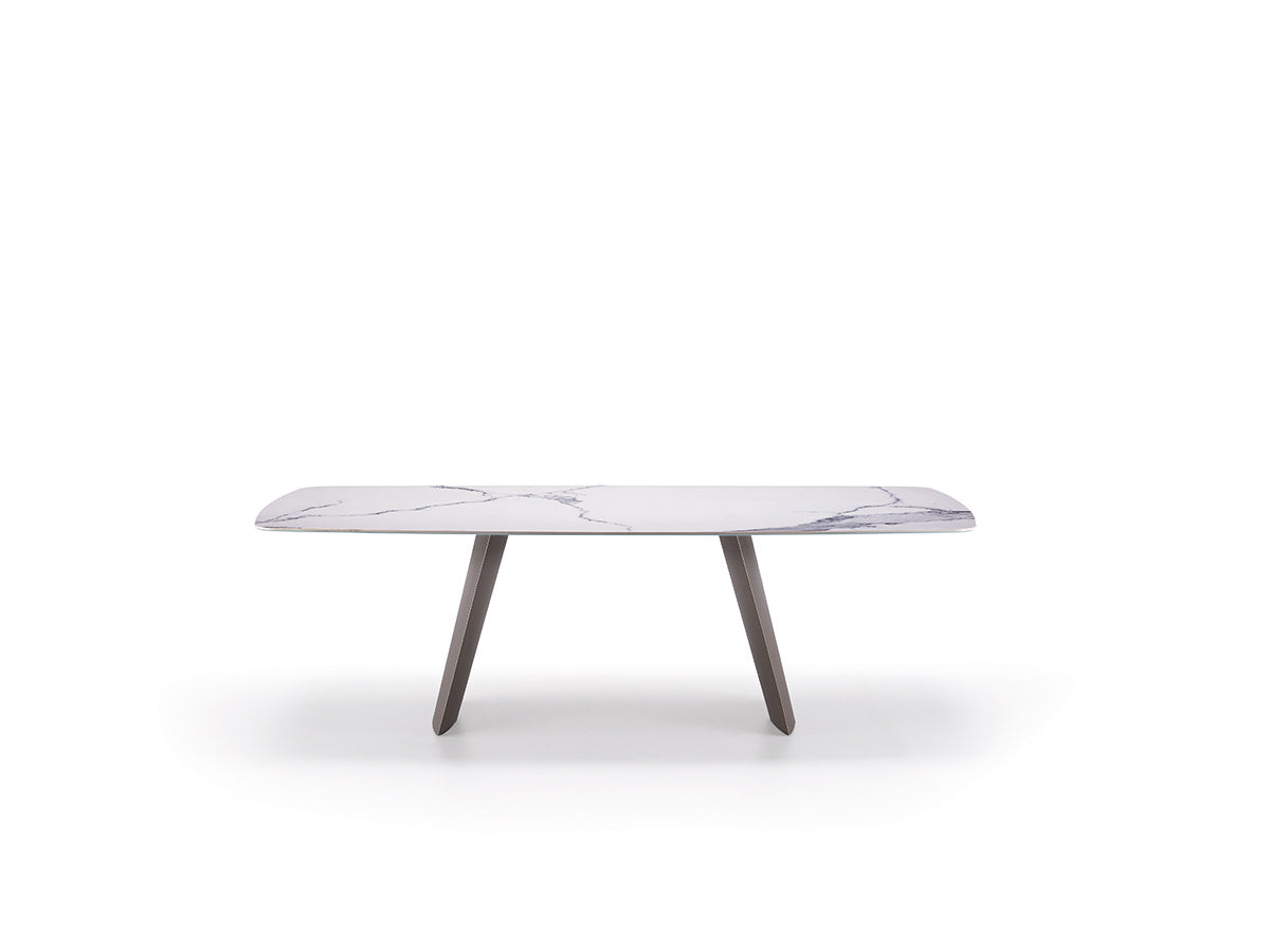 Opera est une table au design essentiel. La base avec supports en forme d'aile en métal peint est disponible en différentes finitions. Plateau proposé en céramique, verre coloré ou bois et disponible en forme rectangulaire ou profilée.