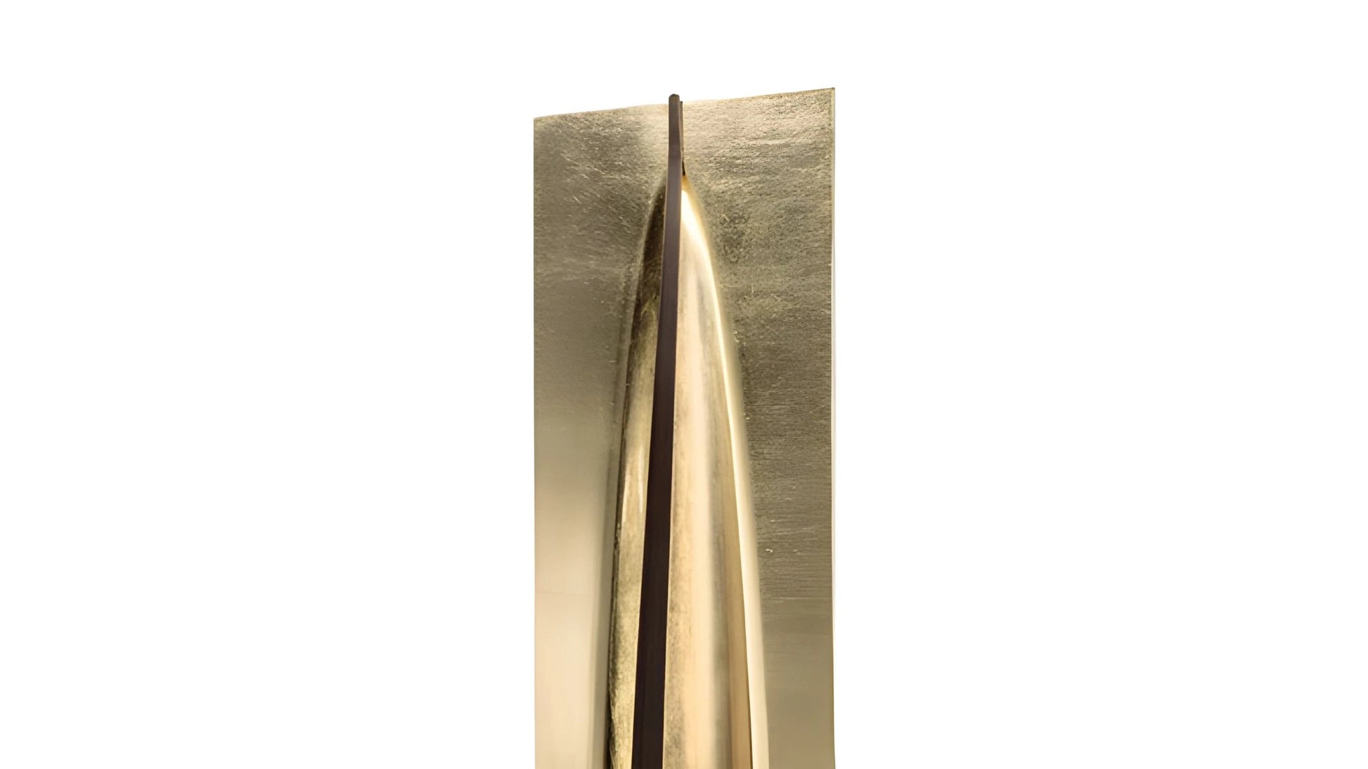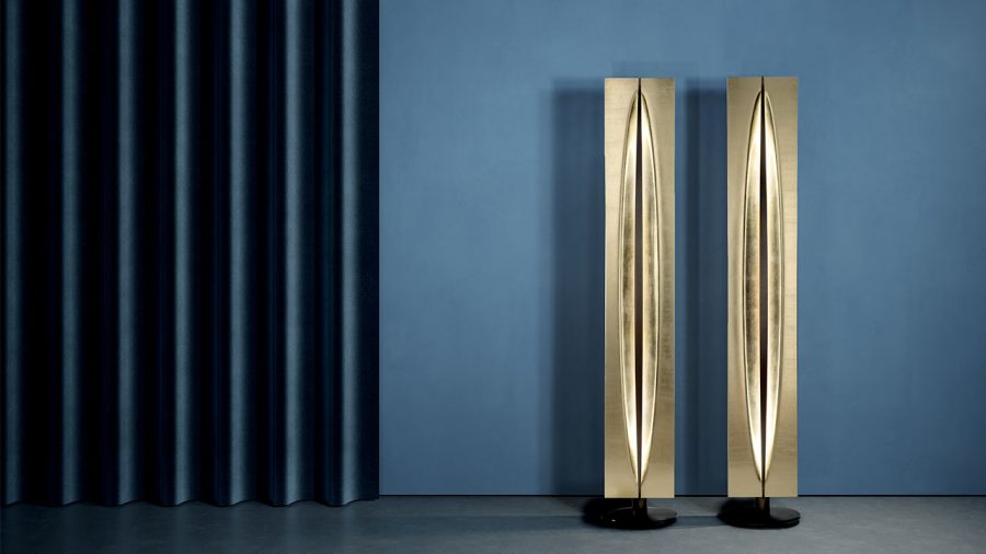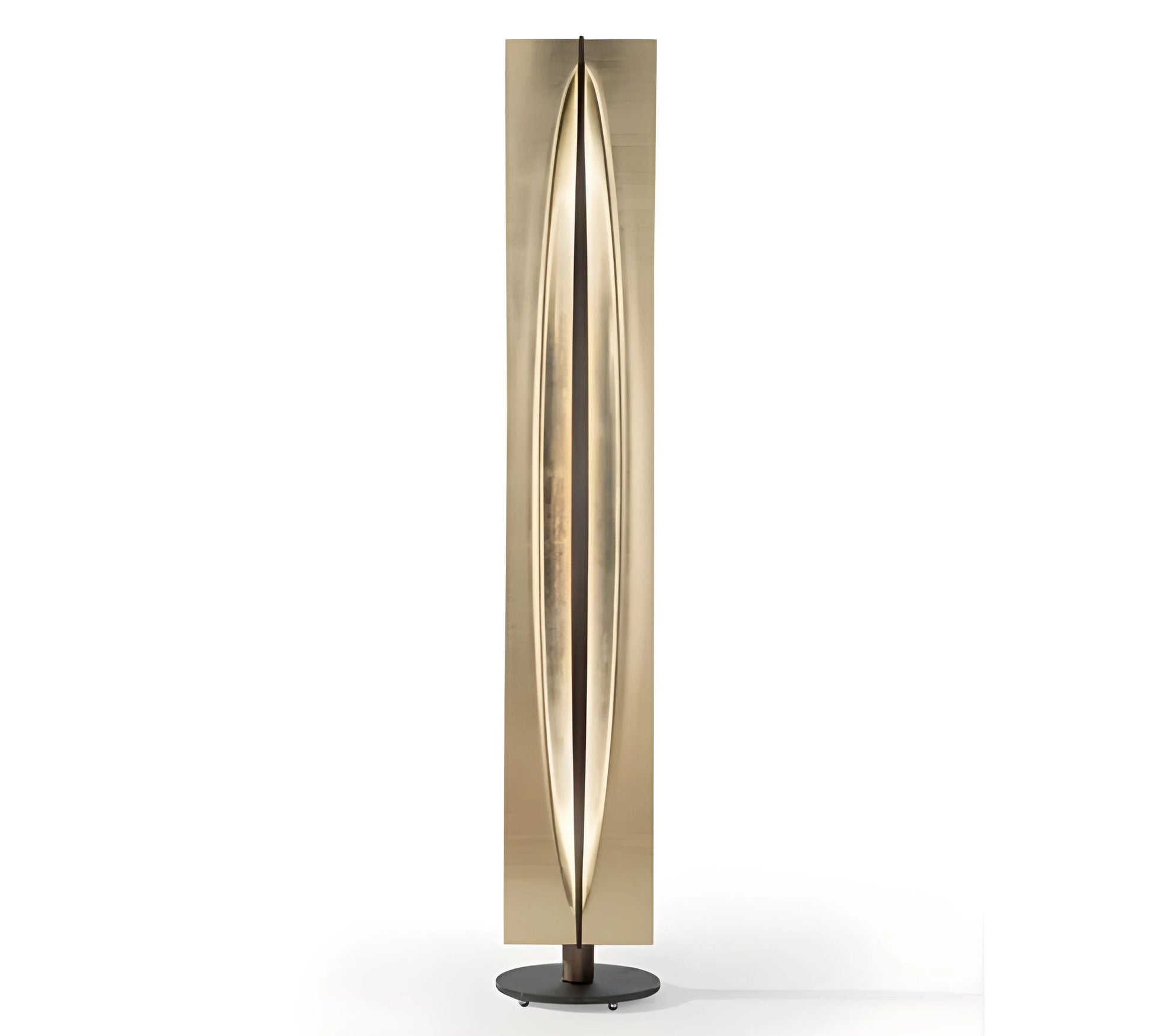 Lampadaire en verre extra-clair bombé ép. 5 mm avec finition à la feuille d'or, pivotant sur une base en verre dépoli à l'acide peint en argile et avec une structure en métal finition laiton. Lame verticale en laiton bruni avec LED STRIP.