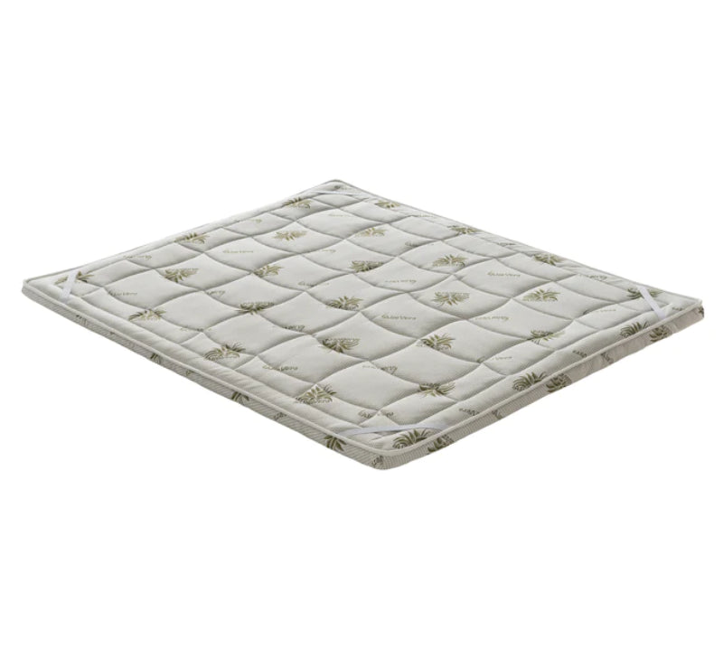 La doublure fixe est en coton rembourré de fibres d'Aloe Vera, un tissu régénérant et émollient, qui augmente les niveaux d'énergie et améliore le bien-être général. Le rembourrage est composé de fibres thermoliées et isolantes de haute qualité, qui ne retiennent pas l'humidité et maintiennent l'ensemble du matelas frais et sec. Les bandes élastiques pratiques positionnées aux 4 coins du surmatelas permettent une parfaite adhérence au matelas et garantissent une stabilité maximale.