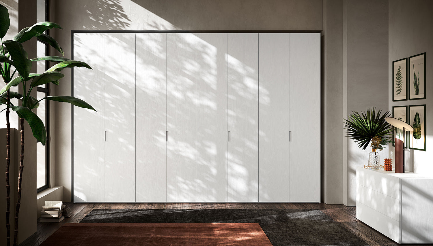 Armadio battente 6/a da 45 L 276 H 252 P 60,3. Bianco frassinato / maniglia ad incasso Ergo in tinta bianca Top Mat. Cerniere Soft Closing.