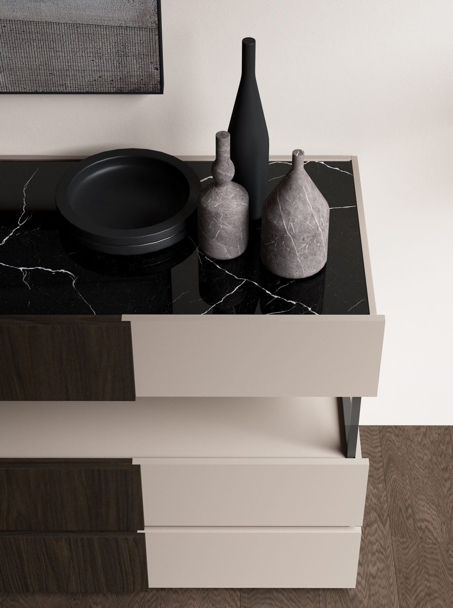 Il comò Infinito sulla parte superiore ha un top ribassato portaoggetti risaltato dal vetro effetto marmo Marquinia.