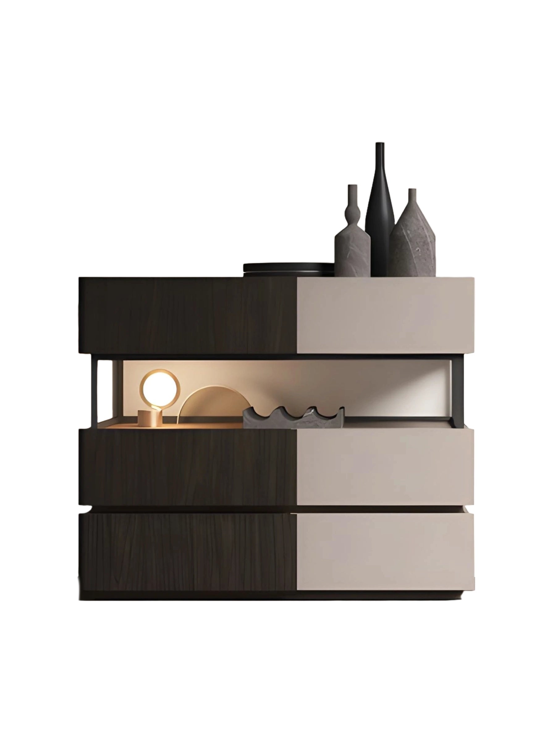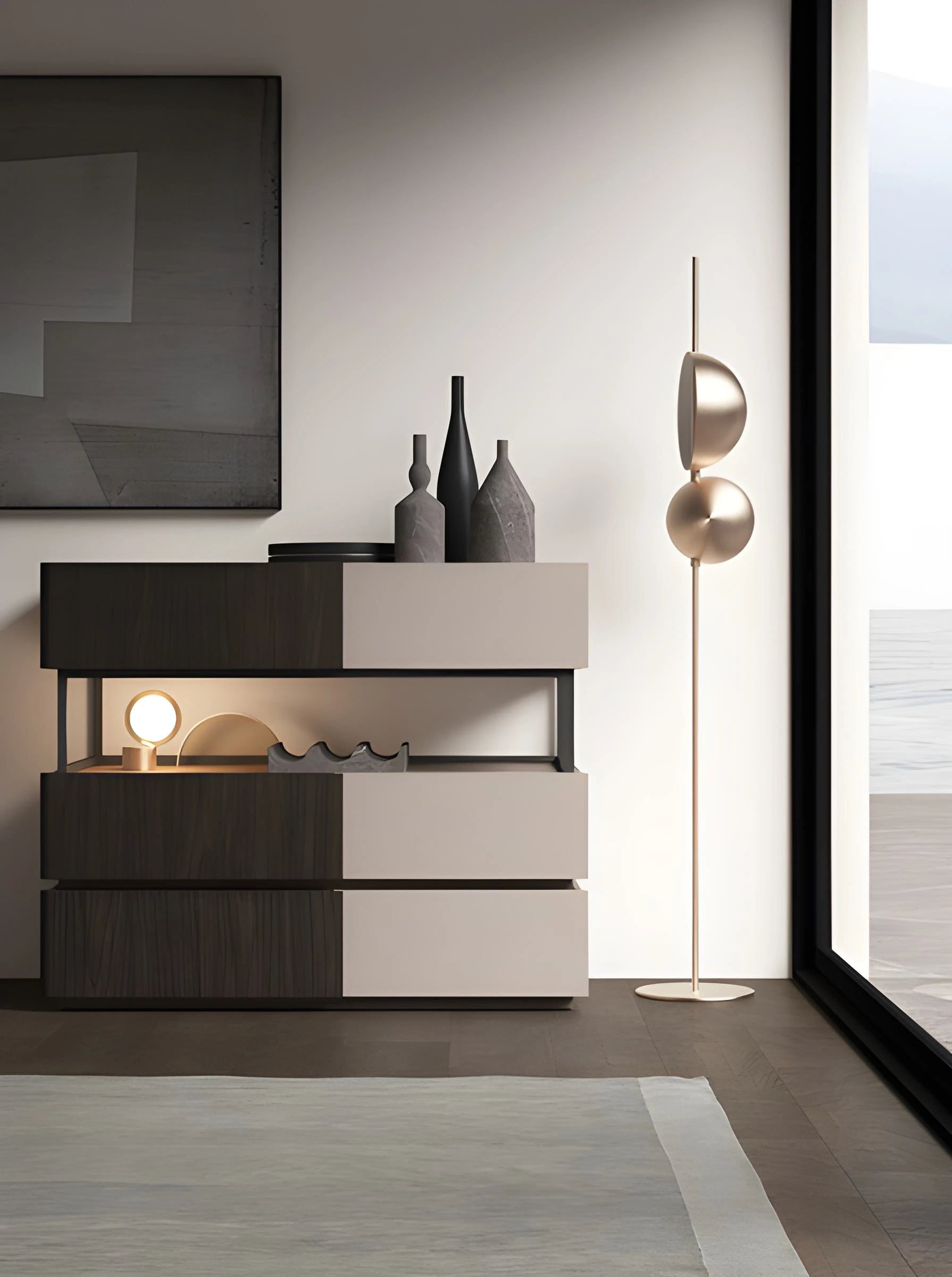 Il volume pieno del comò Infinito è spezzato da un telaio satinato ricavandone un elemento a giorno.