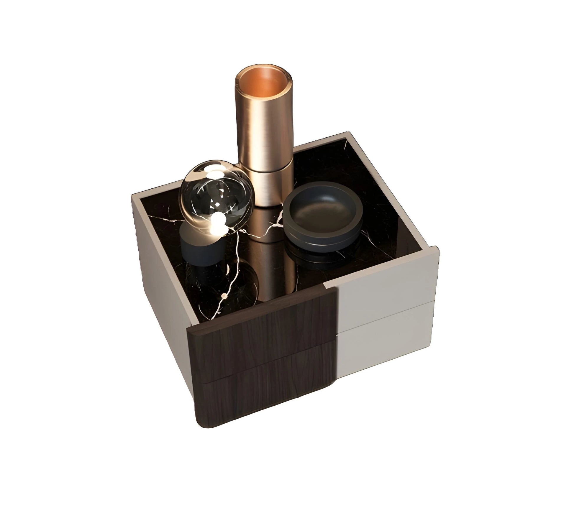 I frontali del comodino Infinito hanno un cambio di spessore e finitura; la presa di apertura può essere laterale o dall'alto per il cassetto superiore.
