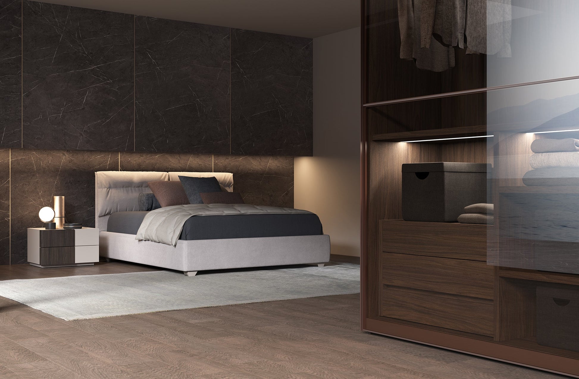 I comodini Infinito sono in Cashmere M058 eTobacco Wood M848. Il top ribassato porta accessori in vetro effetto Marmo Marquinia Nero conferisce un tocco raffinato all’ambiente.