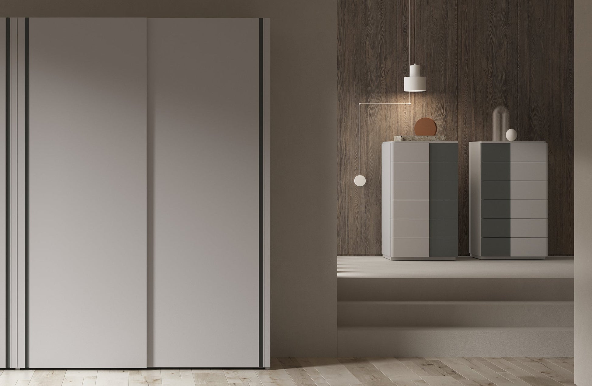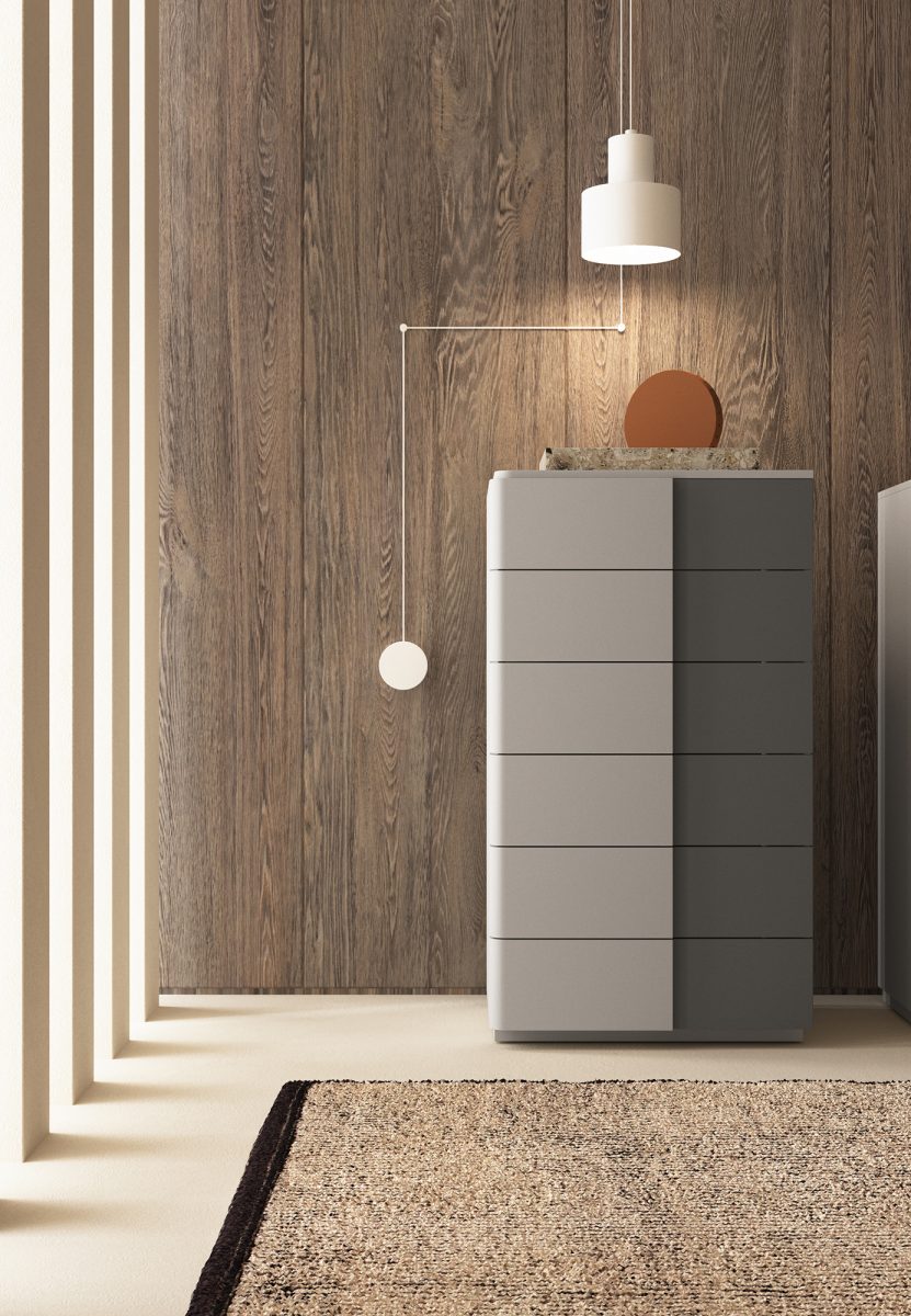 Il settimanale Bombay si caratterizza per la resa tridimensionale dei frontali composti dall’intersezione di due pannelli di diverso spessore. Il disegno estetico funzionale del frontale Bombay è curvo su un lato corto e angolare sull’altro, tramite questi è favorita la presa per l’apertura dei cassetti.